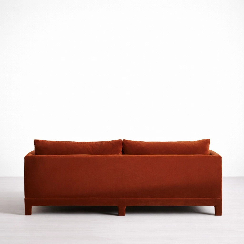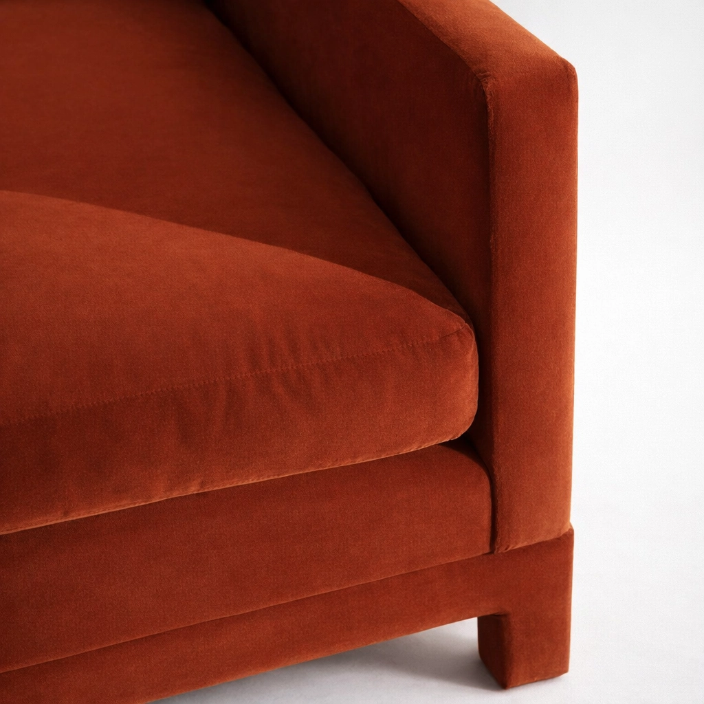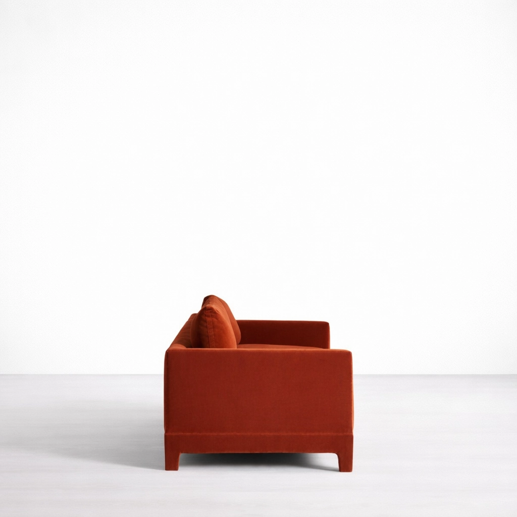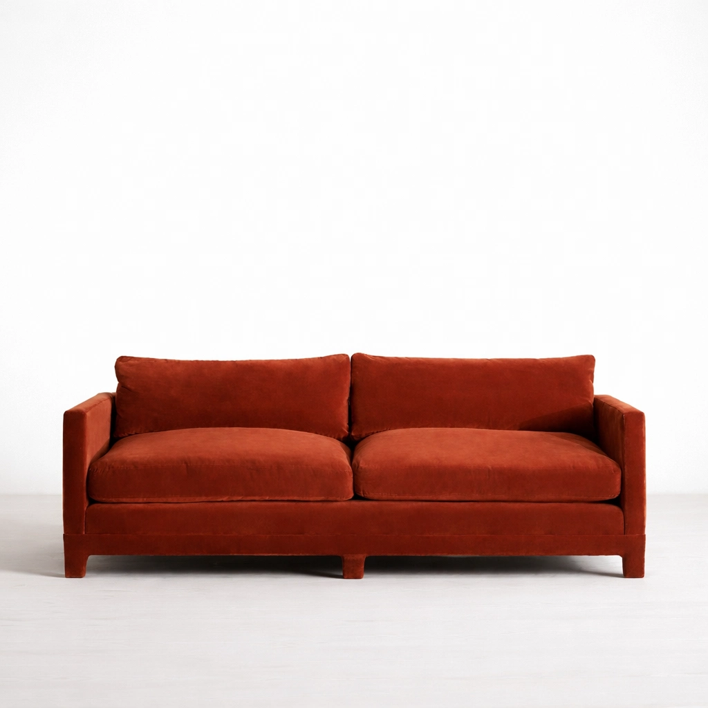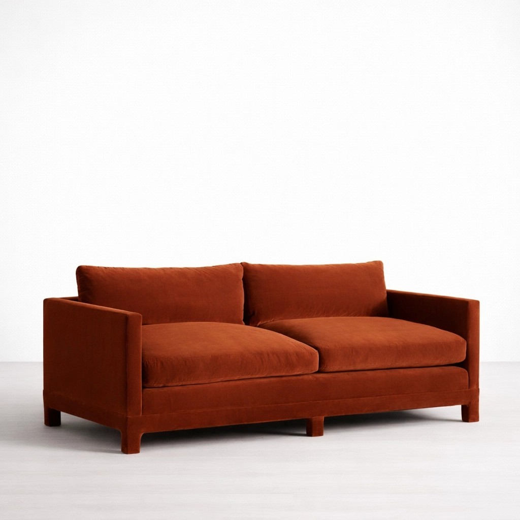 The INTERIORZE rust velvet sofa is designed for homes that prefer simple forms with a confident presence. Its box-arm silhouette and generous cushions create a look that feels modern yet inviting. The rust or terracotta velvet tone brings warmth to neutral interiors and pairs well with wood, brass, black accents, and natural textures.