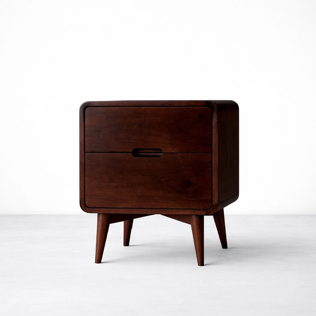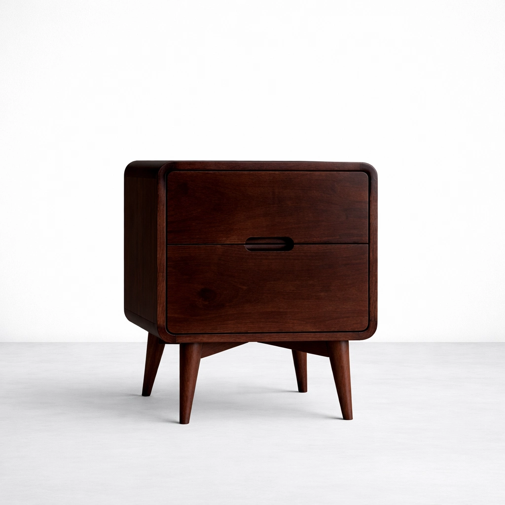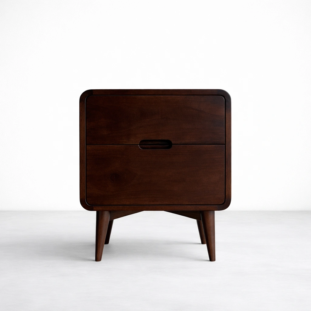 Its design features two drawers that provide useful storage for books, chargers, glasses, medicines, notebooks, and other daily bedside essentials. The clean drawer front and integrated pull detail keep the overall look minimal and uncluttered, while the softly rounded outer frame brings a gentle modern character to the piece.