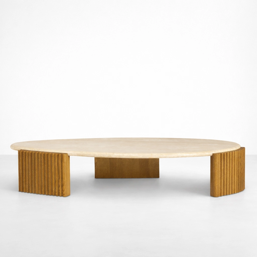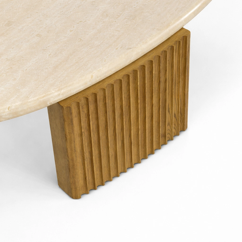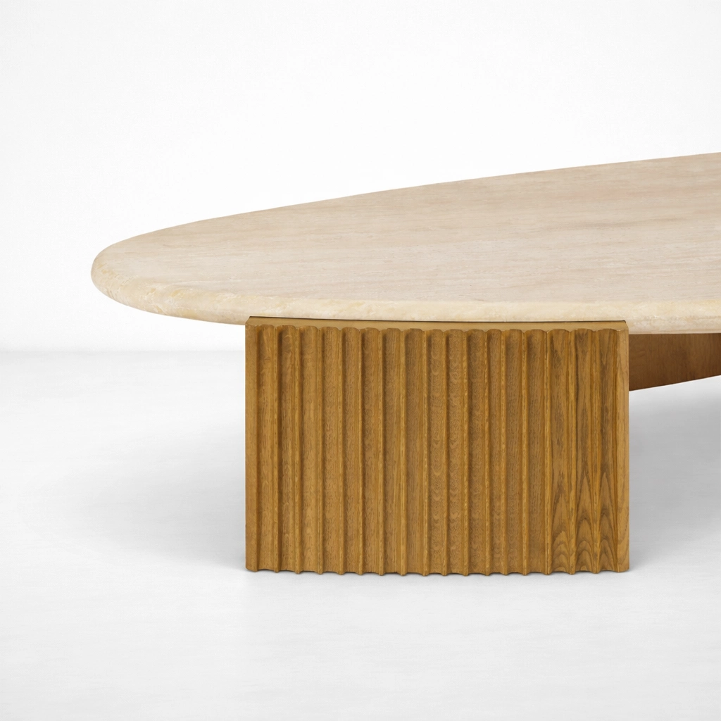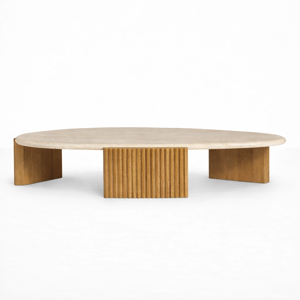 Its oval marble top and fluted teakwood base create a balanced design that feels elegant, warm, and visually distinctive.