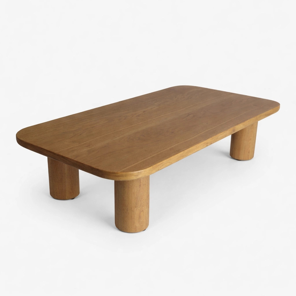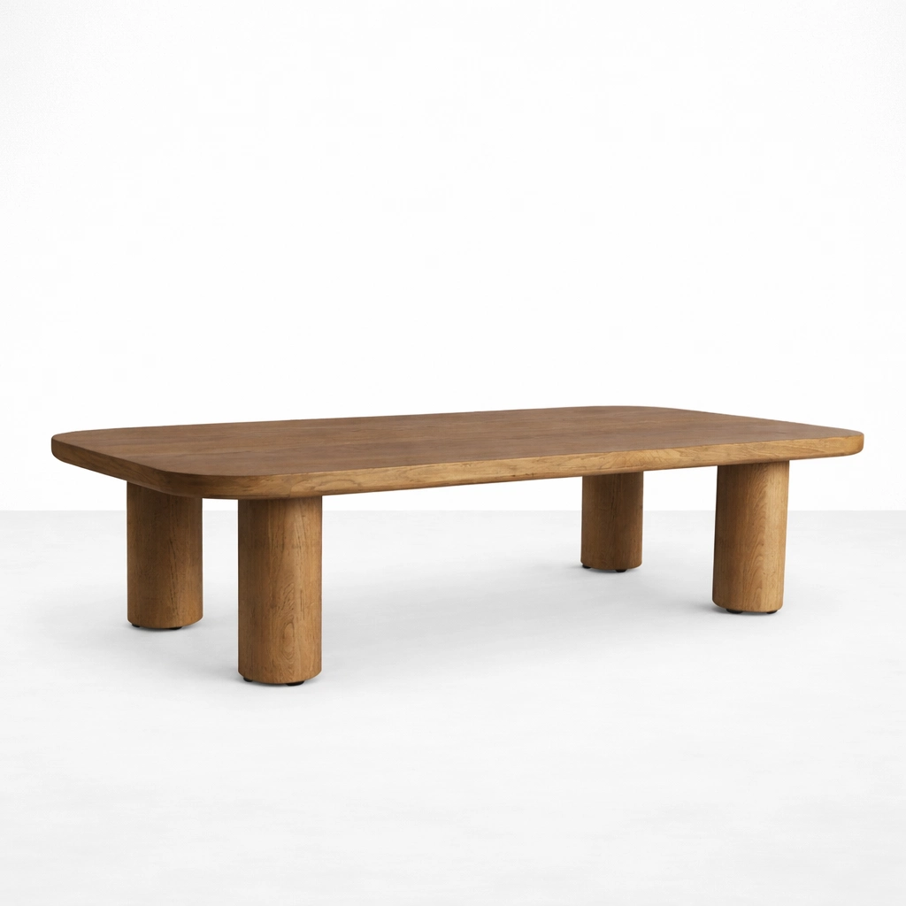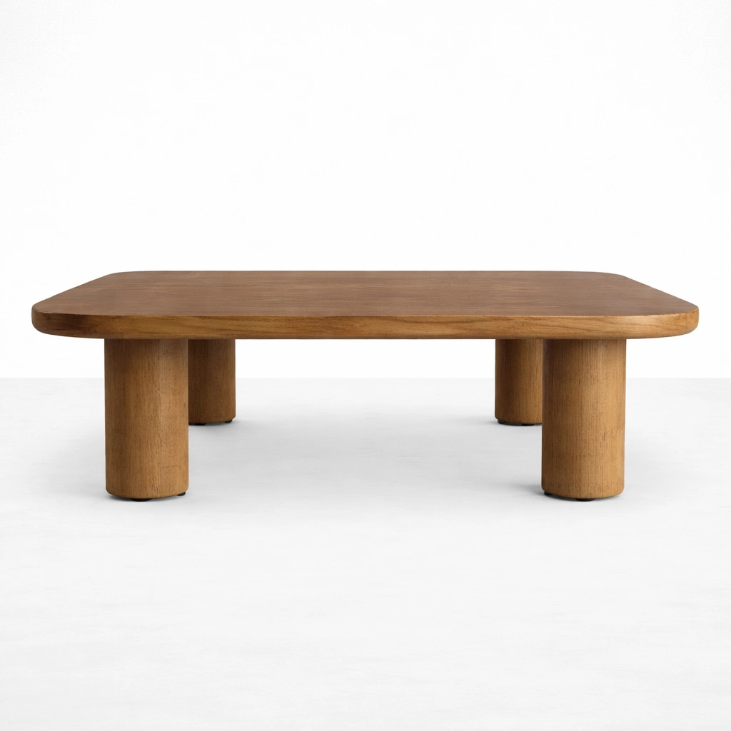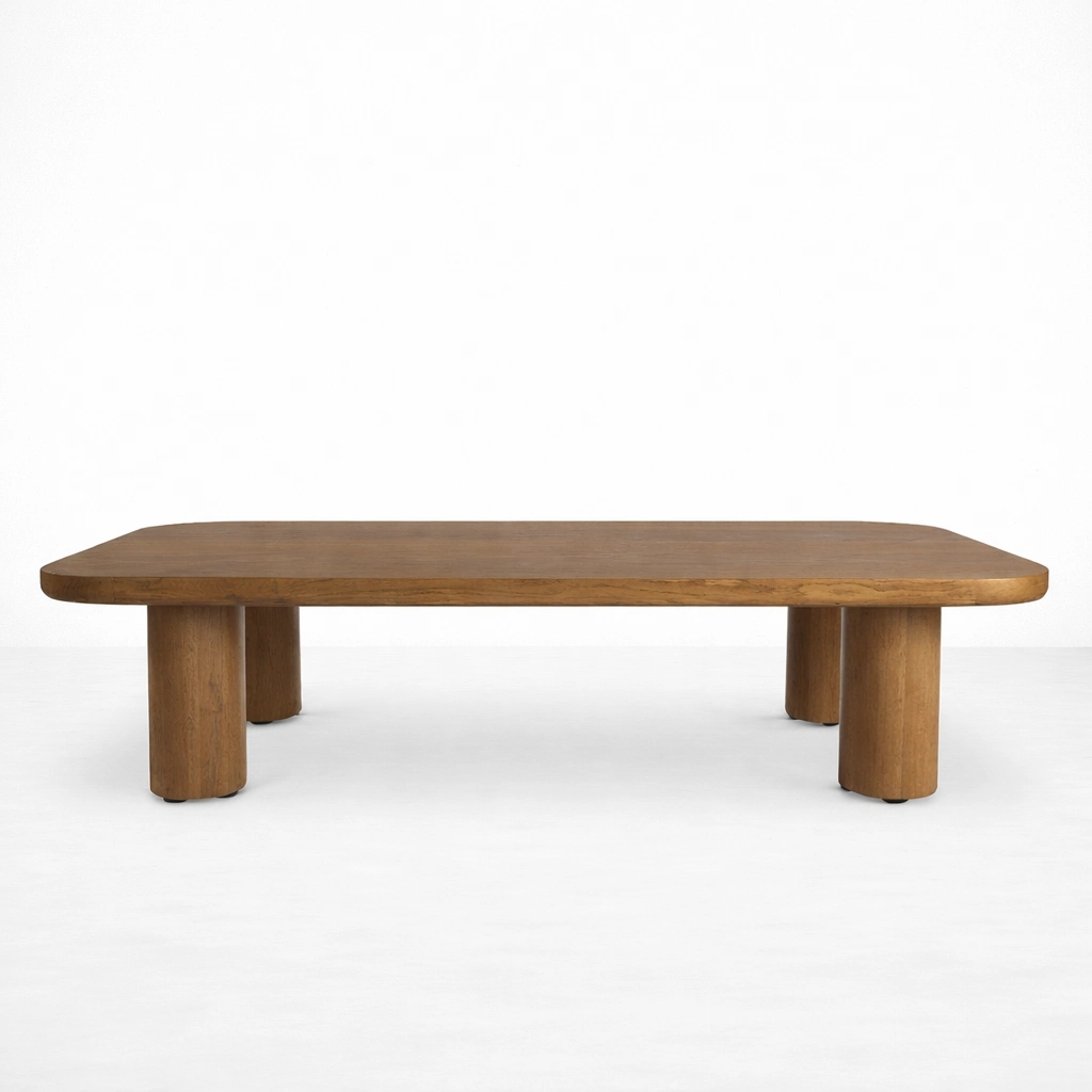 Its gently curved corners soften the overall look, while the warm teakwood grain adds depth and character to the surface. The low-profile form helps keep the room feeling open and calm, making it especially suitable for modern, minimal, and contemporary living spaces. The cylindrical leg design adds quiet strength and visual balance without making the piece feel heavy.
