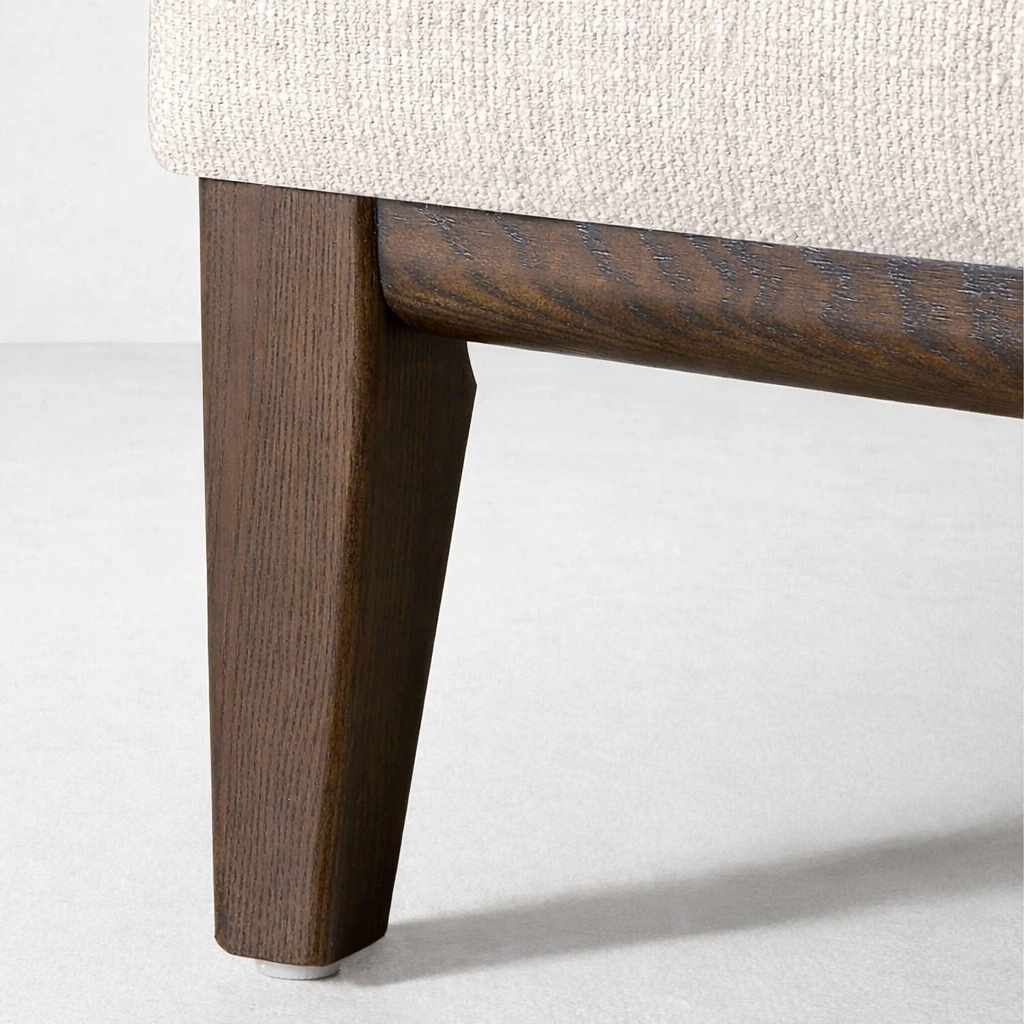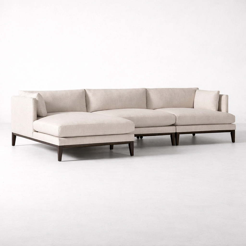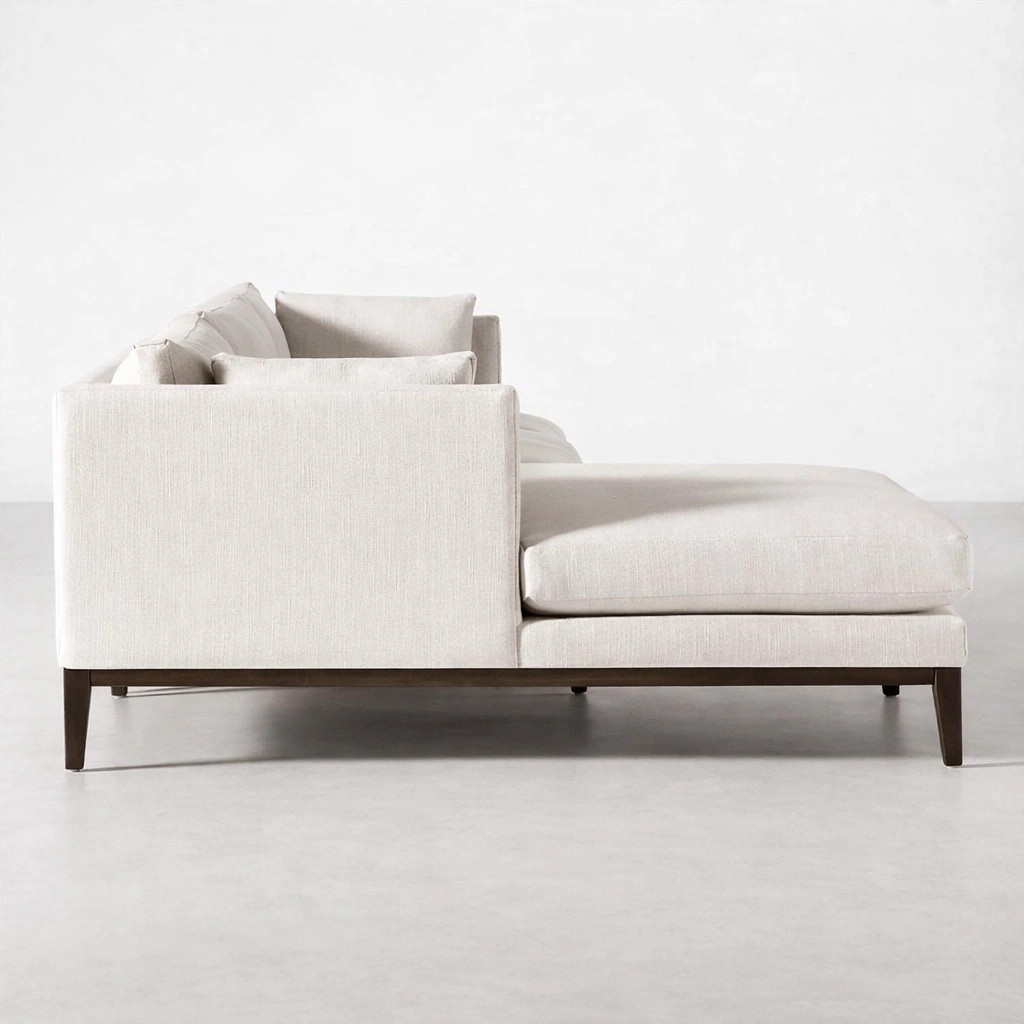 We keep our work simple and honest. Each Haven sofa is made to order, so you can choose a layout and size that fits your room properly. From chaise direction to upholstery selection and wood polish, we can tailor the details so the final piece feels natural in your space ivory L-shape sectional sofa with teakwood base.