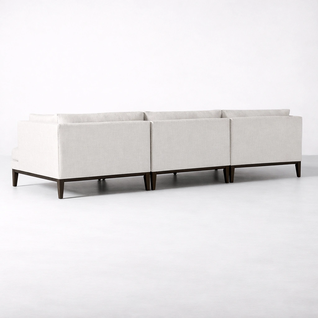 • Back view of ivory sectional sofa showing clean panels and teakwood legs