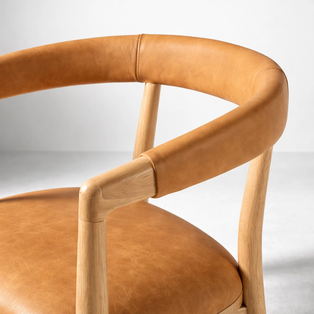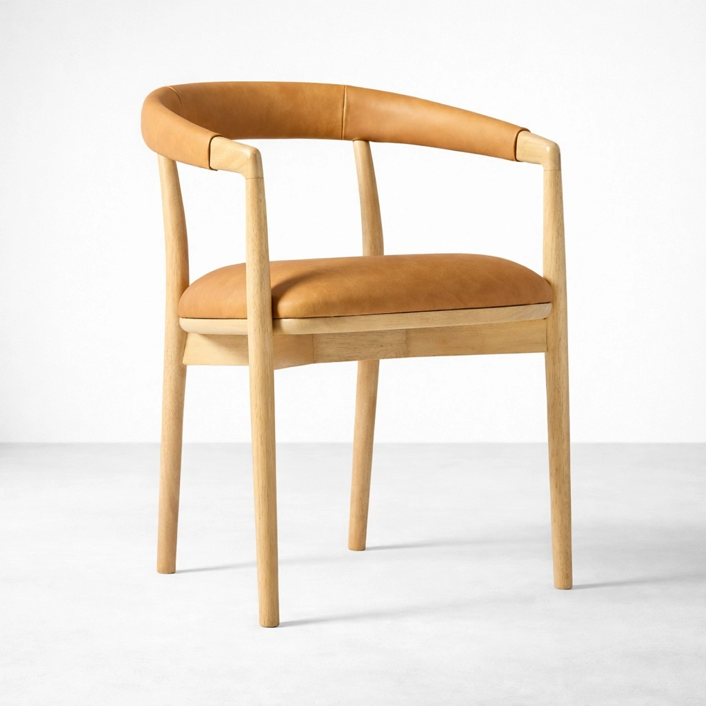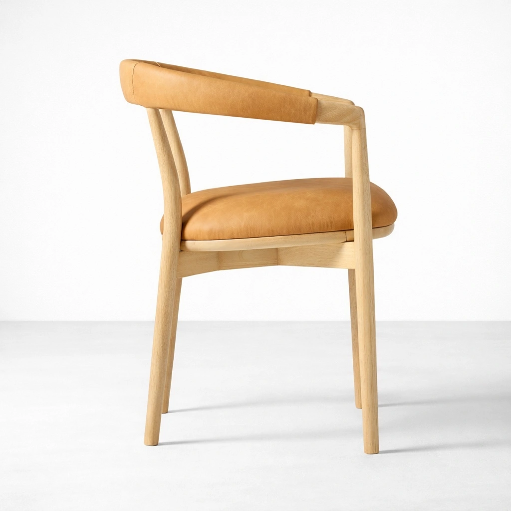 The seat is generously cushioned and upholstered in a tan tone that pairs beautifully with natural wood. A softly padded back rail adds comfort while maintaining an elegant curved profile. The structure is supported by well-balanced legs and carefully finished joints, making it suitable for everyday dining use as well as hospitality seating.
