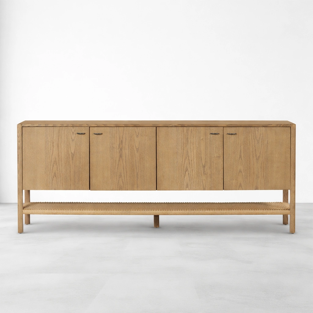 Sideboard Type: Four-door concealed storage sideboard with lower woven shelf