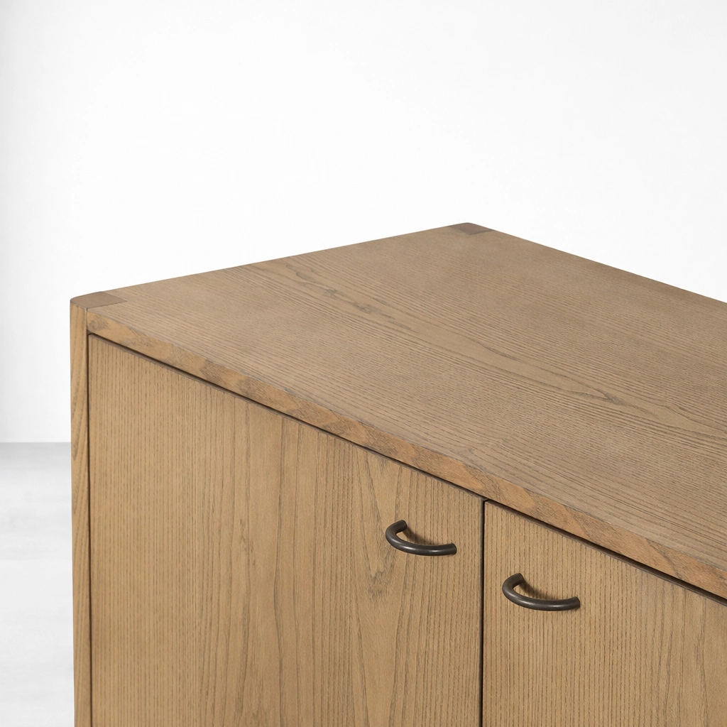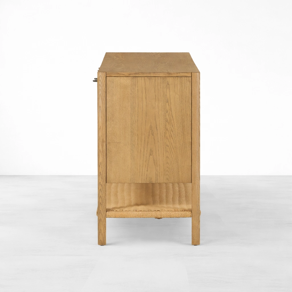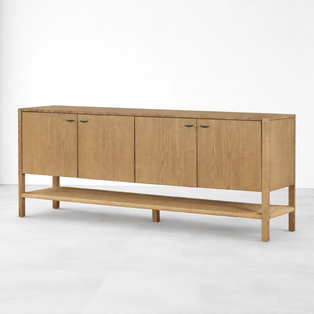 The form of the Loom Shelf Ash Wood Sideboard is simple, but its proportions give it a quiet and memorable identity. The long ash wood body feels refined and versatile, while the woven lower shelf adds an understated handcrafted touch. This makes the piece suitable as a sideboard, buffet cabinet, storage console, or long wooden cabinet for interiors that value both function and understated design.