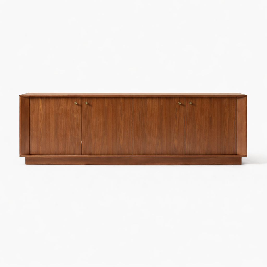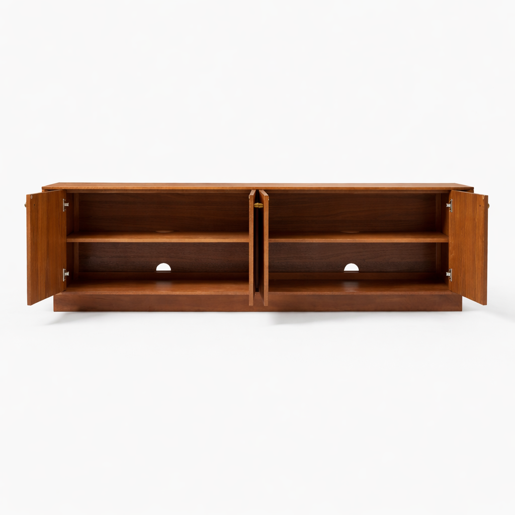 The INTERIORZE Lowline Plinth Teak Wood Media Console is a thoughtfully designed furniture piece created for interiors that appreciate clean lines, warm wood tones, and practical concealed storage. Made in teak wood, this media console features a long horizontal silhouette, four front doors, inner shelving, cable access cutouts, and a grounded plinth-style base that gives the design a calm and architectural presence.
