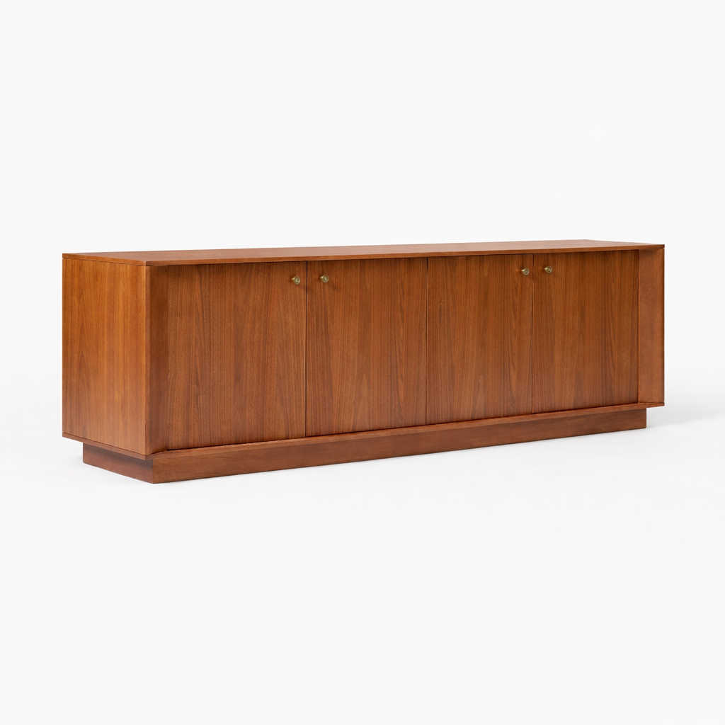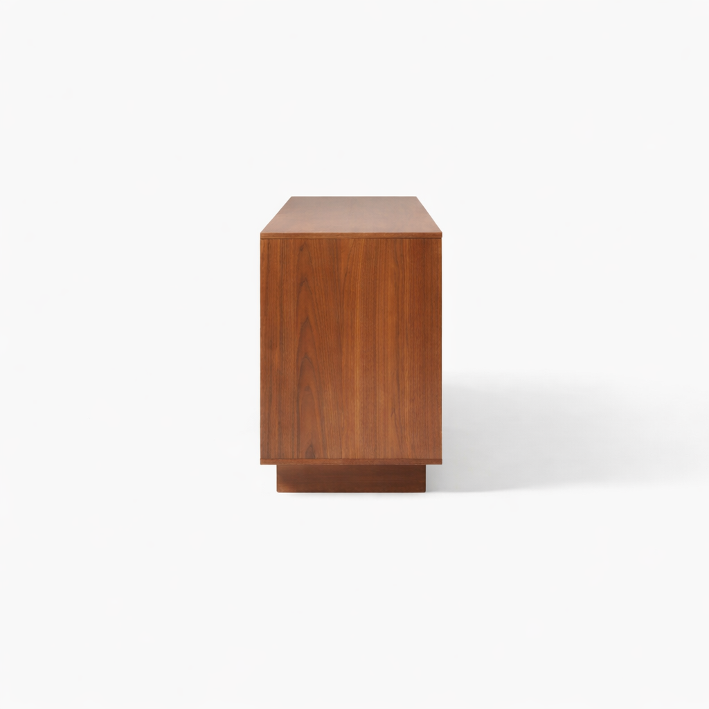 The form of the Lowline Plinth Teak Wood Media Console is simple, but its proportions give it a quiet and memorable identity. It can function as a TV unit, entertainment cabinet, media console, or long storage console while still maintaining a refined visual presence. The broad top surface offers room for a television, decorative objects, lighting, or art, while the enclosed storage keeps the surrounding space looking neat and composed.