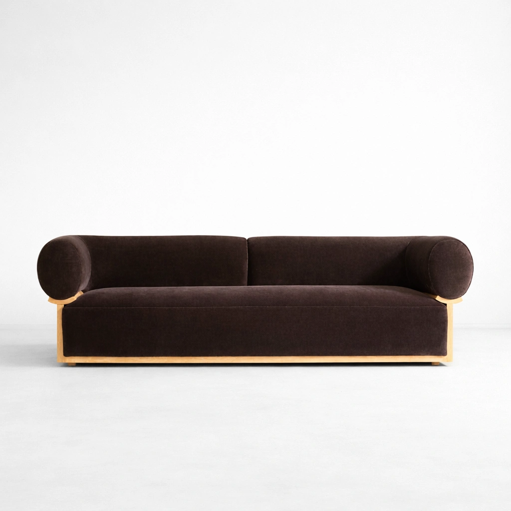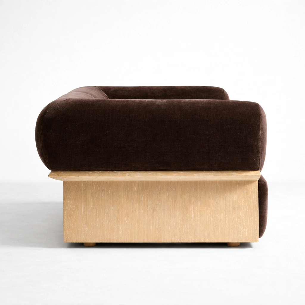 The structure is supported by an ash wood internal frame, chosen for stability and long-term durability. The visible wood base keeps the sofa grounded and adds a warm contrast to the velvet upholstery.