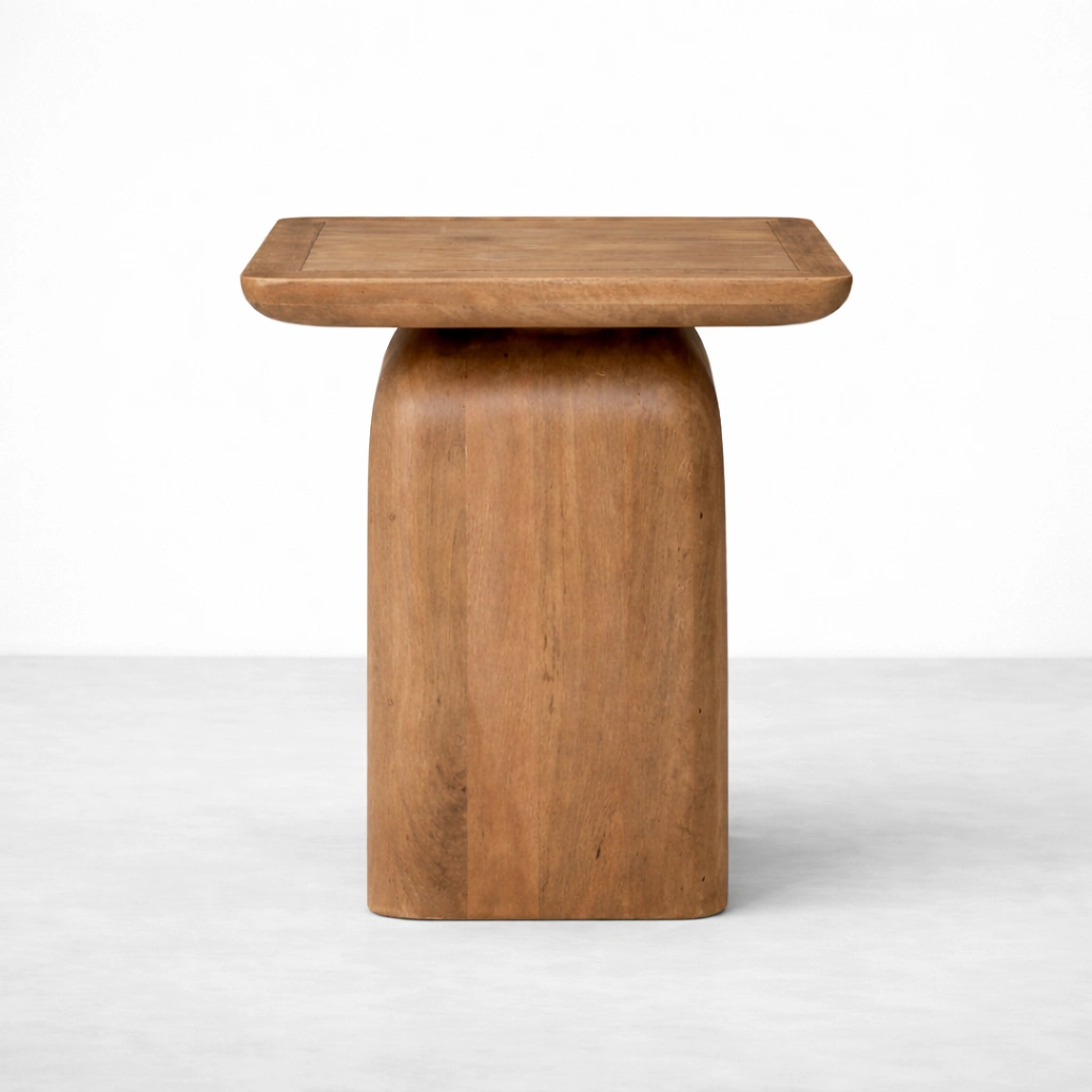 The Monolith Curve Teak Wood Side Table works beautifully beside a sofa, lounge chair, or bed, and can also be styled in living rooms, bedrooms, reading corners, studio spaces, and boutique hospitality interiors. The square top offers practical surface space for books, lighting, décor, or everyday essentials, while the sculptural base gives the piece visual interest from every angle.