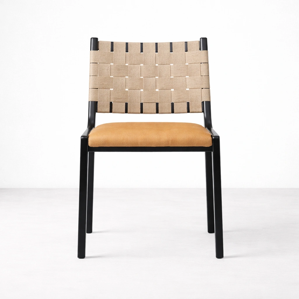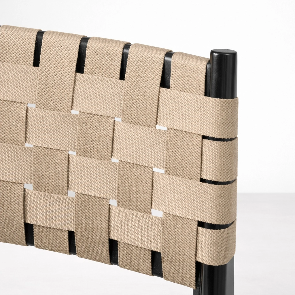 The seat is padded for everyday comfort and upholstered in a tan tone that complements the black frame and neutral weave. With its stable legs and balanced proportions, this strap back dining chair fits well in dining rooms, apartments, cafes, and restaurant seating. The woven back provides a flexible, supportive feel while keeping the chair breathable for longer sitting hours.