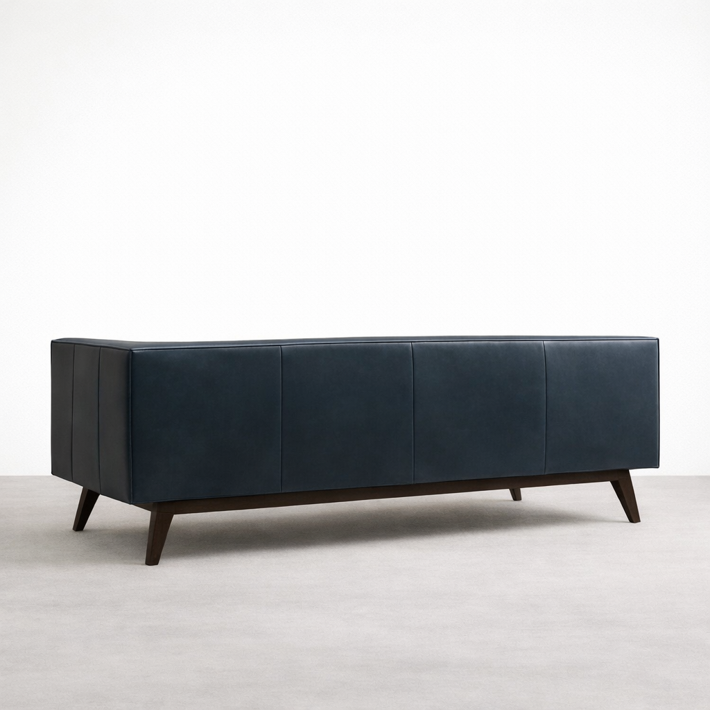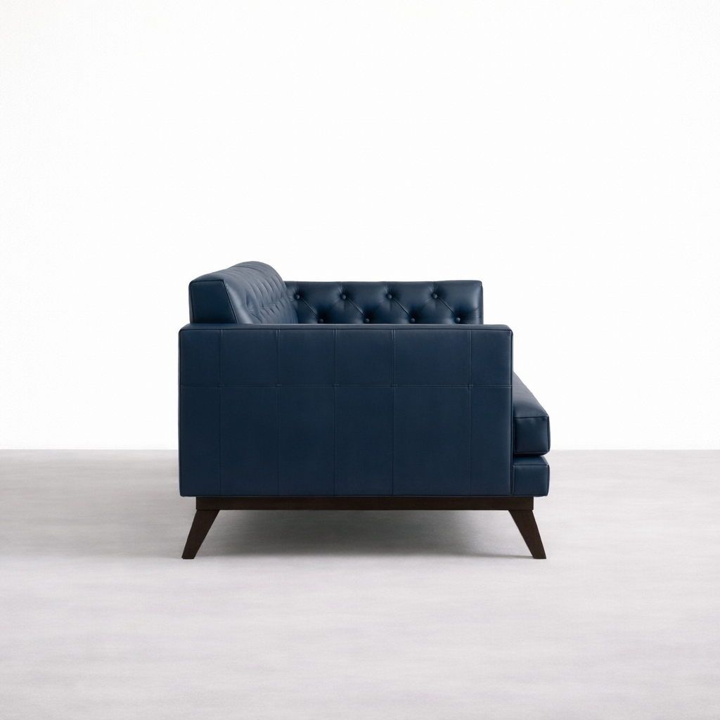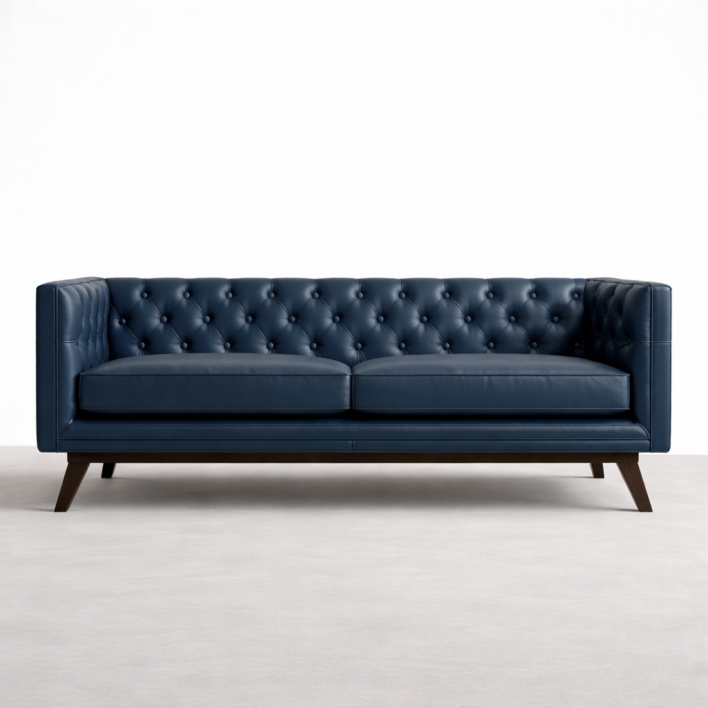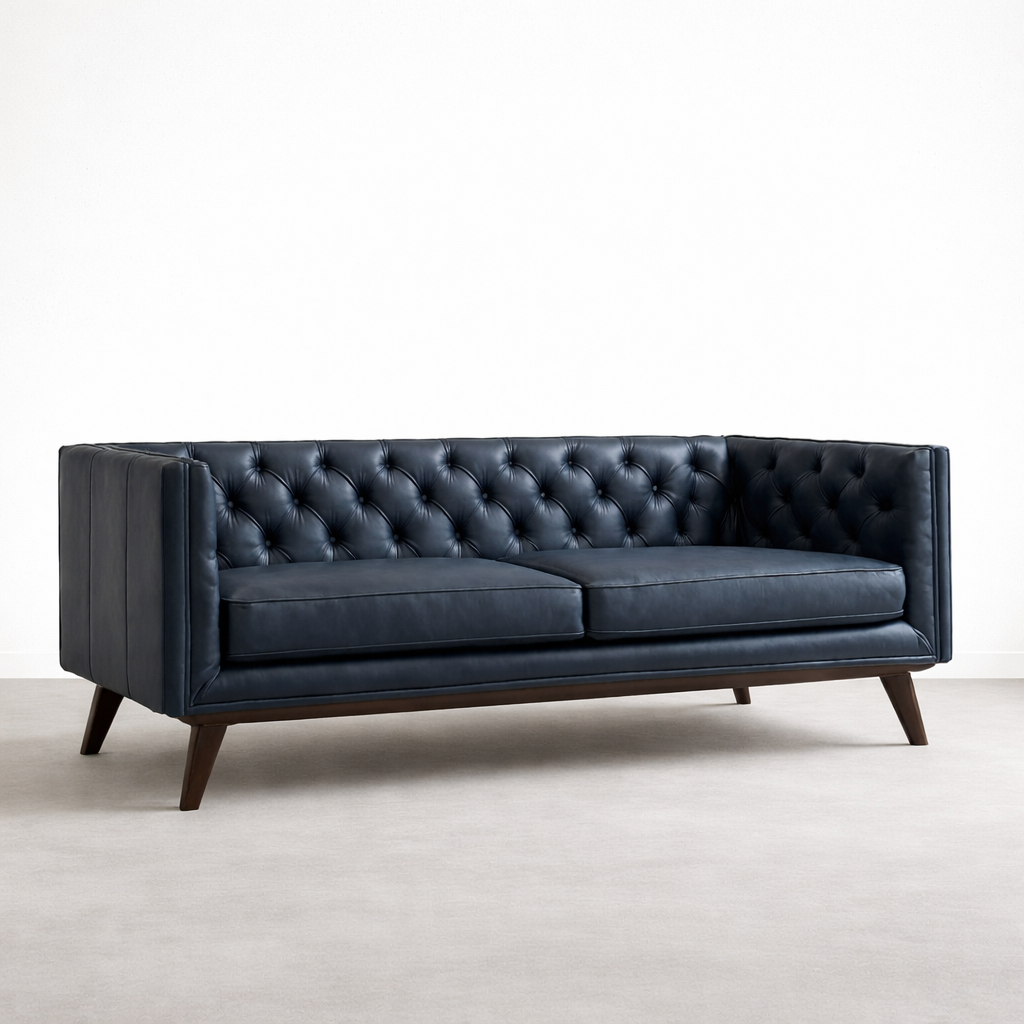 The Navy Blue Tufted Leather Sofa is designed for those who appreciate a timeless tufted back with a structured, modern profile. The deep navy tone adds richness without overpowering the room, while the clean arms and angled teakwood legs keep the silhouette balanced. This sofa works well with neutral walls, warm wood tones, brass accents, and modern lighting Navy Blue Tufted Leather Sofa.