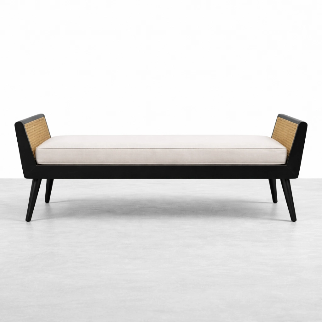 Noir cane end teak wood bench by INTERIORZE is thoughtfully designed for interiors that appreciate contrast, texture, and clean proportions. The soft upholstered seat brings comfort to everyday use, while the cane side panels add a handcrafted detail that keeps the design light, airy, and visually refined.