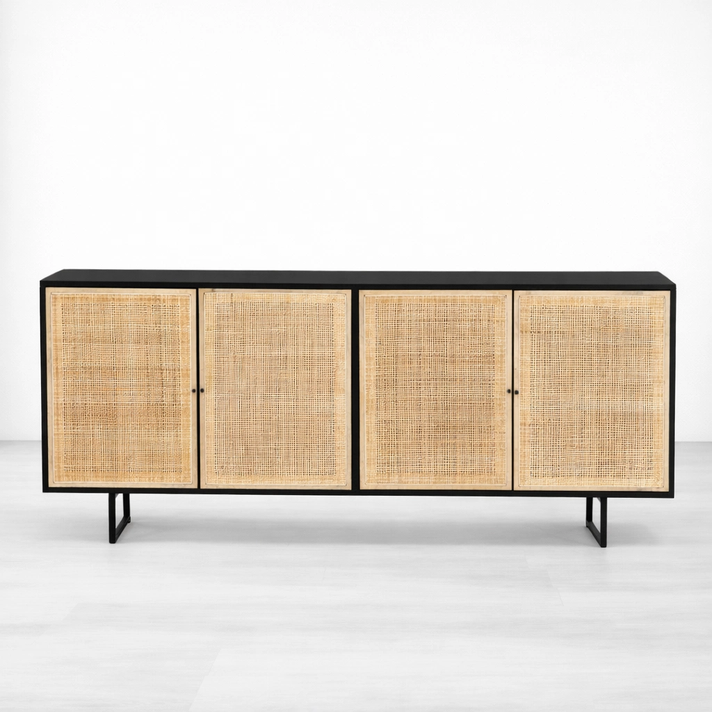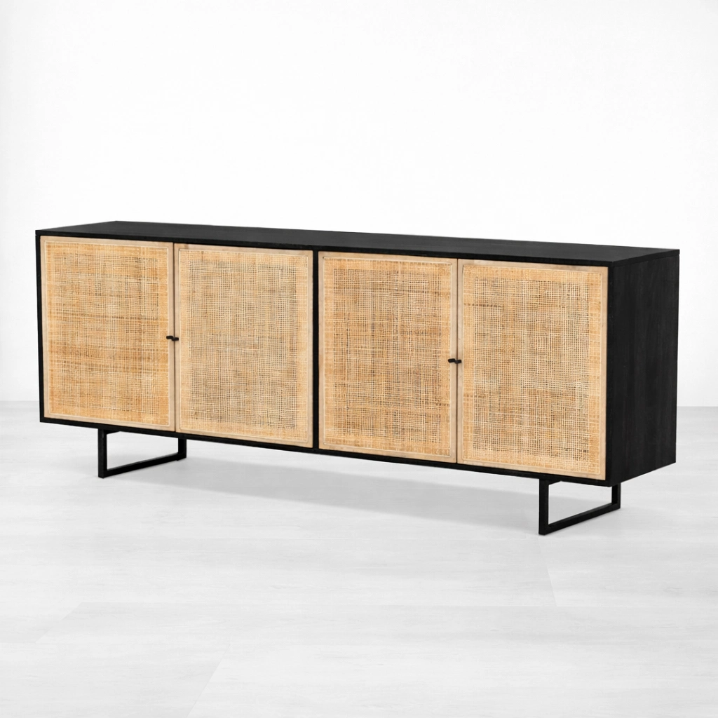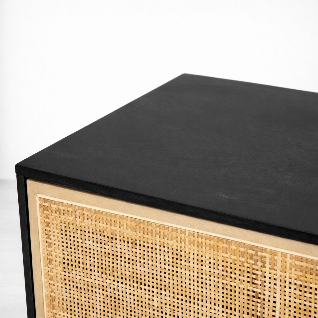 The form of the Noir Cane Teak Wood Sideboard is simple, but its proportions give it a quiet and memorable identity. The black frame gives the piece a grounded presence, while the natural cane panels soften the overall look and bring texture to the front elevation. This makes the piece suitable as a sideboard, buffet cabinet, storage console, or statement cabinet for interiors that value both utility and understated character.