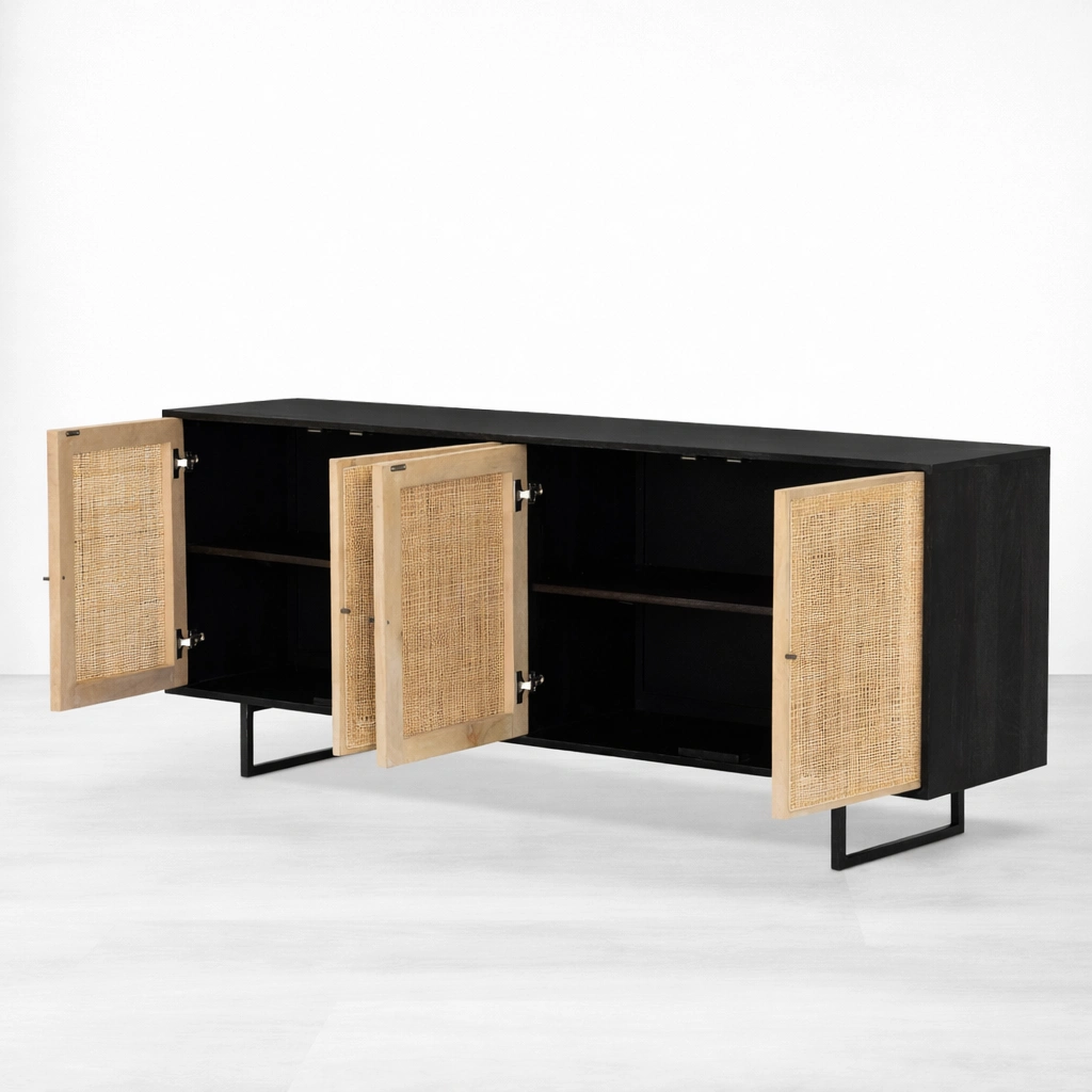 The INTERIORZE Noir Cane Teak Wood Sideboard is a thoughtfully designed furniture piece created for interiors that appreciate clean structure, warm natural texture, and practical concealed storage. Made in teak wood, this sideboard features a long horizontal silhouette with four cane-front doors, internal shelving, a black-finished outer frame, and a slim metal base that gives the design a calm and contemporary presence.
