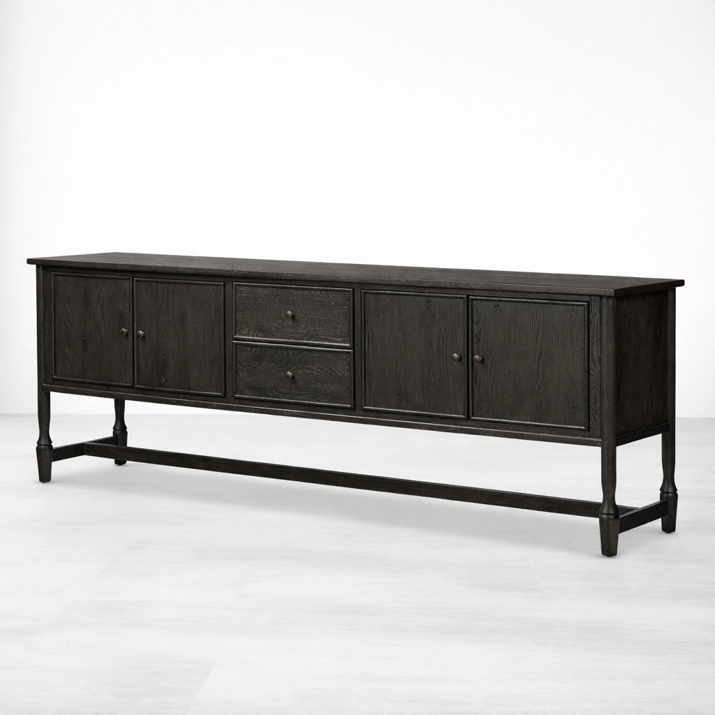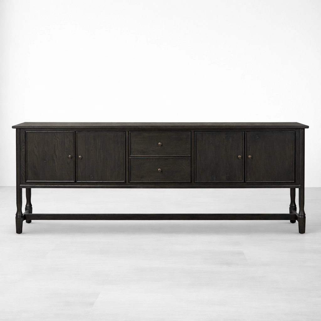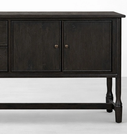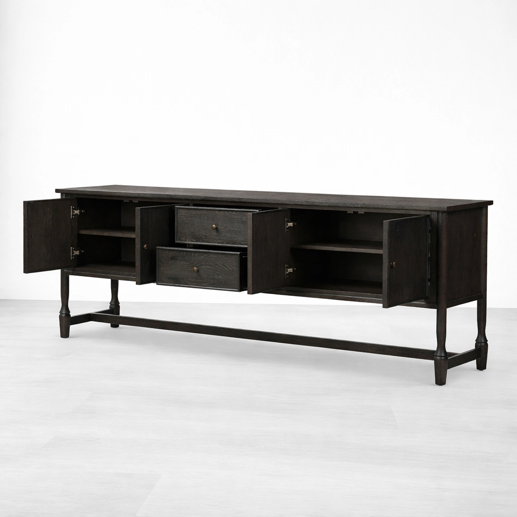 The form of the Noir Frame Teak Wood Sideboard is simple, but its proportions give it a quiet and memorable identity. The dark finish adds visual depth, while the elevated open-frame base keeps the piece refined and balanced. This makes it suitable as a sideboard, buffet cabinet, storage console, or statement cabinet for interiors that value both utility and understated design.
