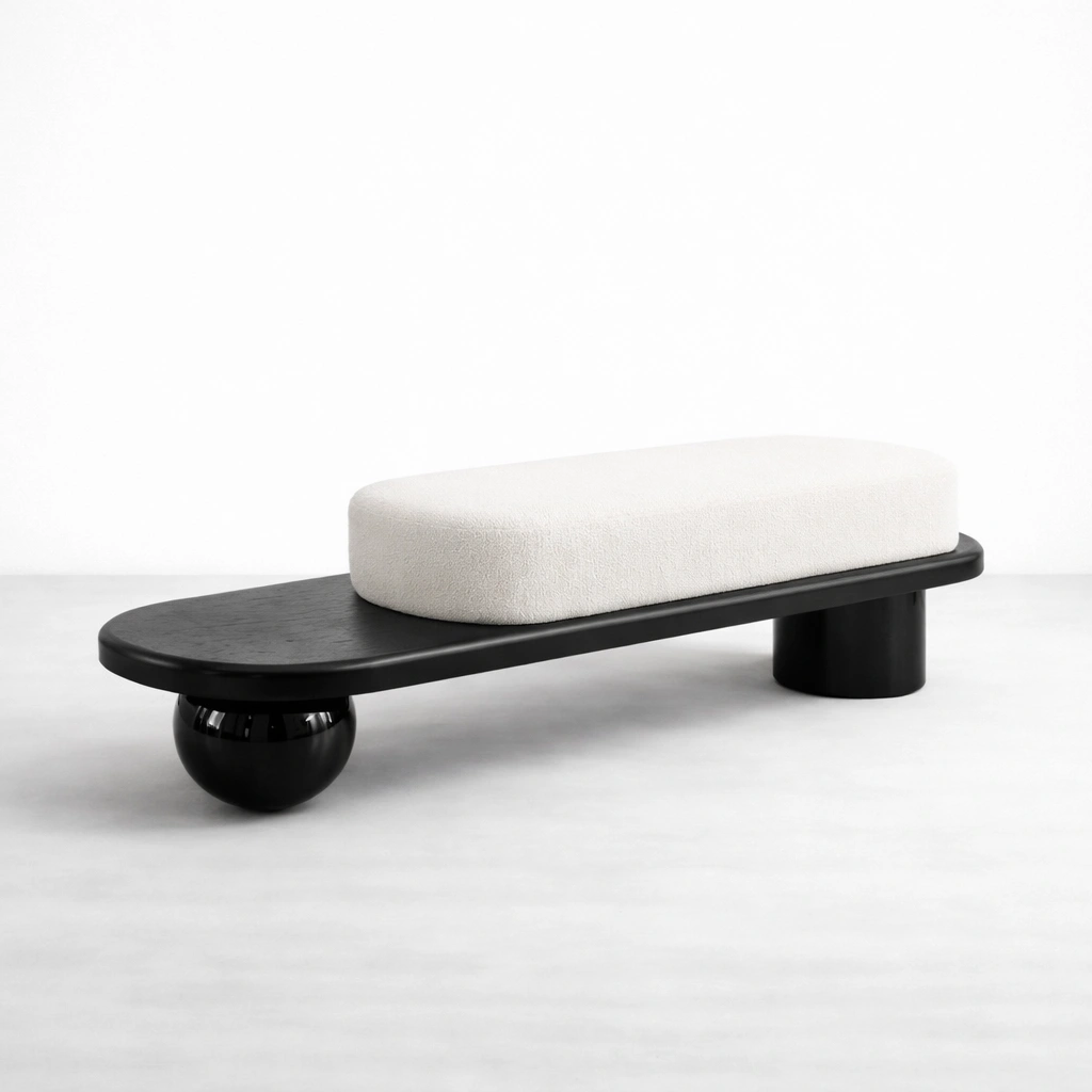 This design stands out through its distinctive base composition. One side features a rounded ball-style support, while the other side is anchored with a cylindrical pedestal leg. These bold details give the bench a gallery-inspired look without making it feel heavy. The softly curved platform edges add visual smoothness, while the thick upholstered seat offers comfort for everyday use black wood platform bench.