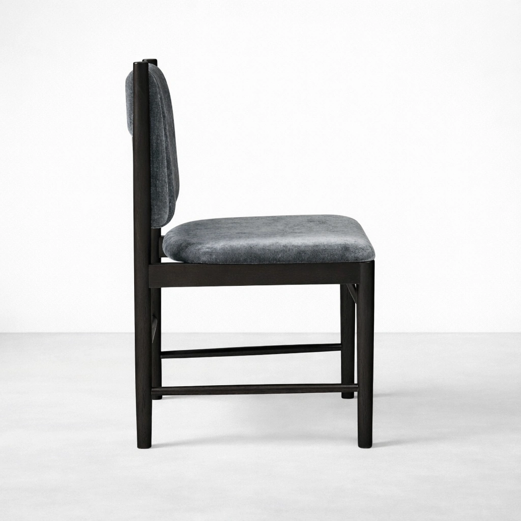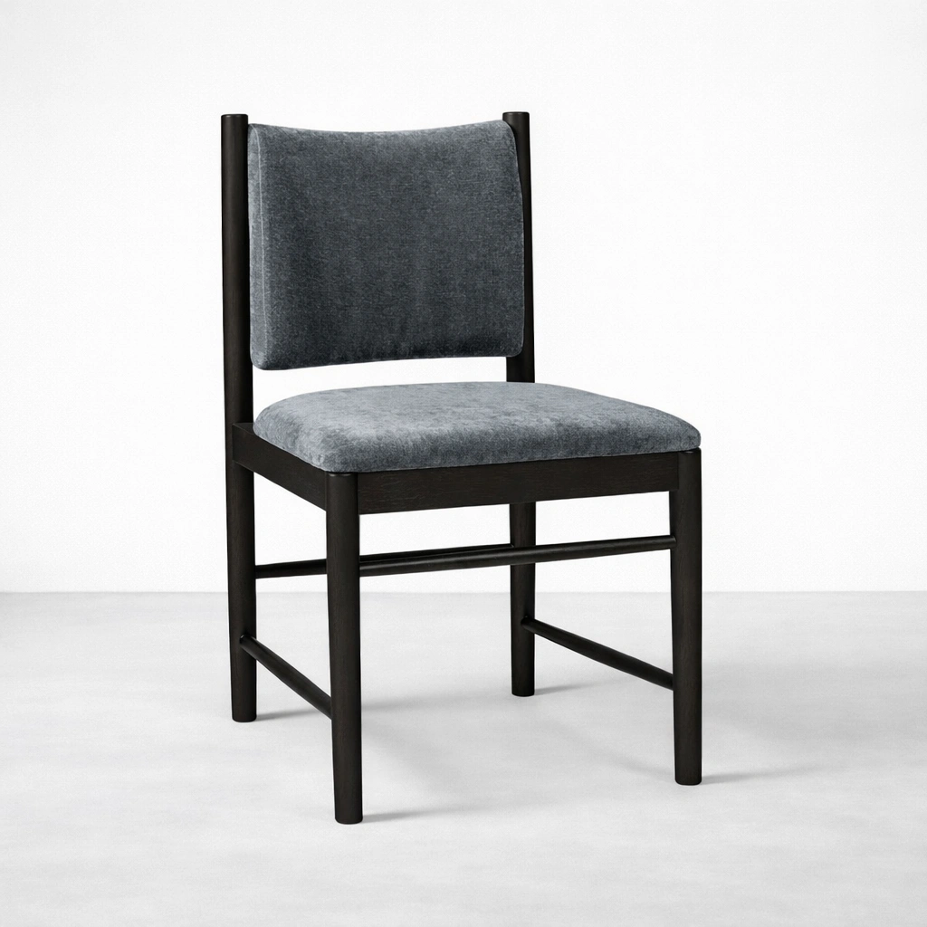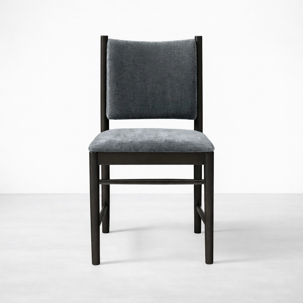 This slate grey upholstered dining chair works well in dining rooms, cafés, restaurants, meeting areas, and studio spaces. The balanced proportions and neutral upholstery make it easy to pair with wooden, marble, glass, or metal dining tables.