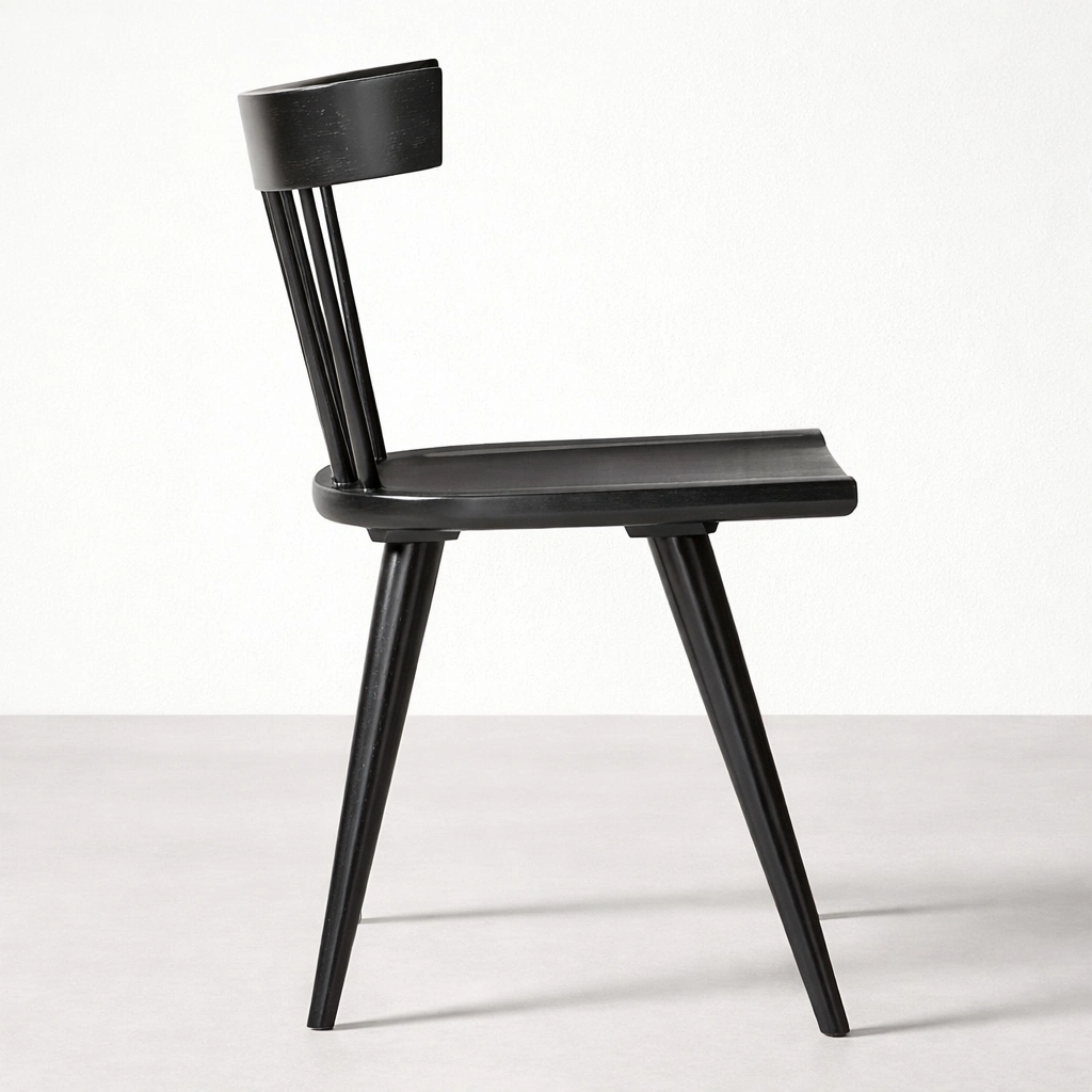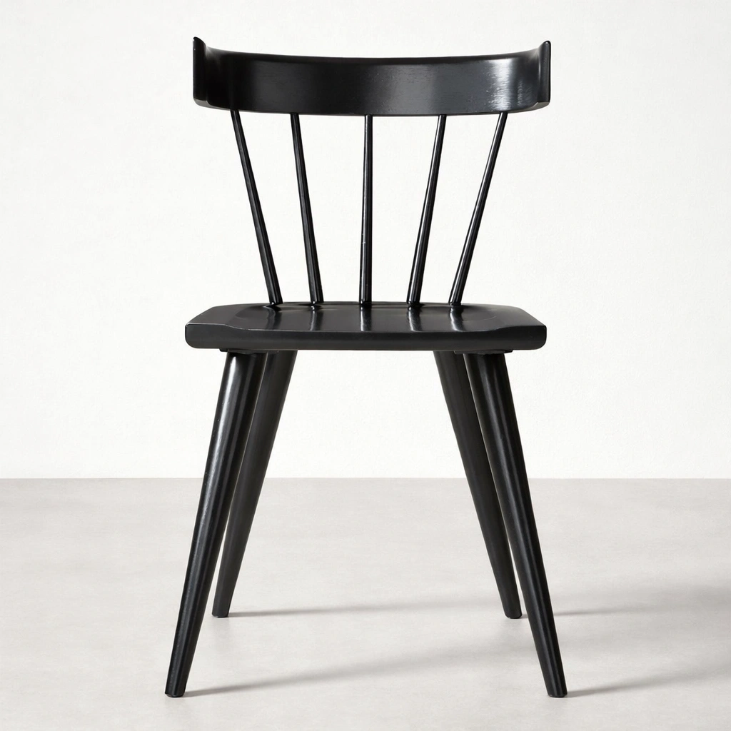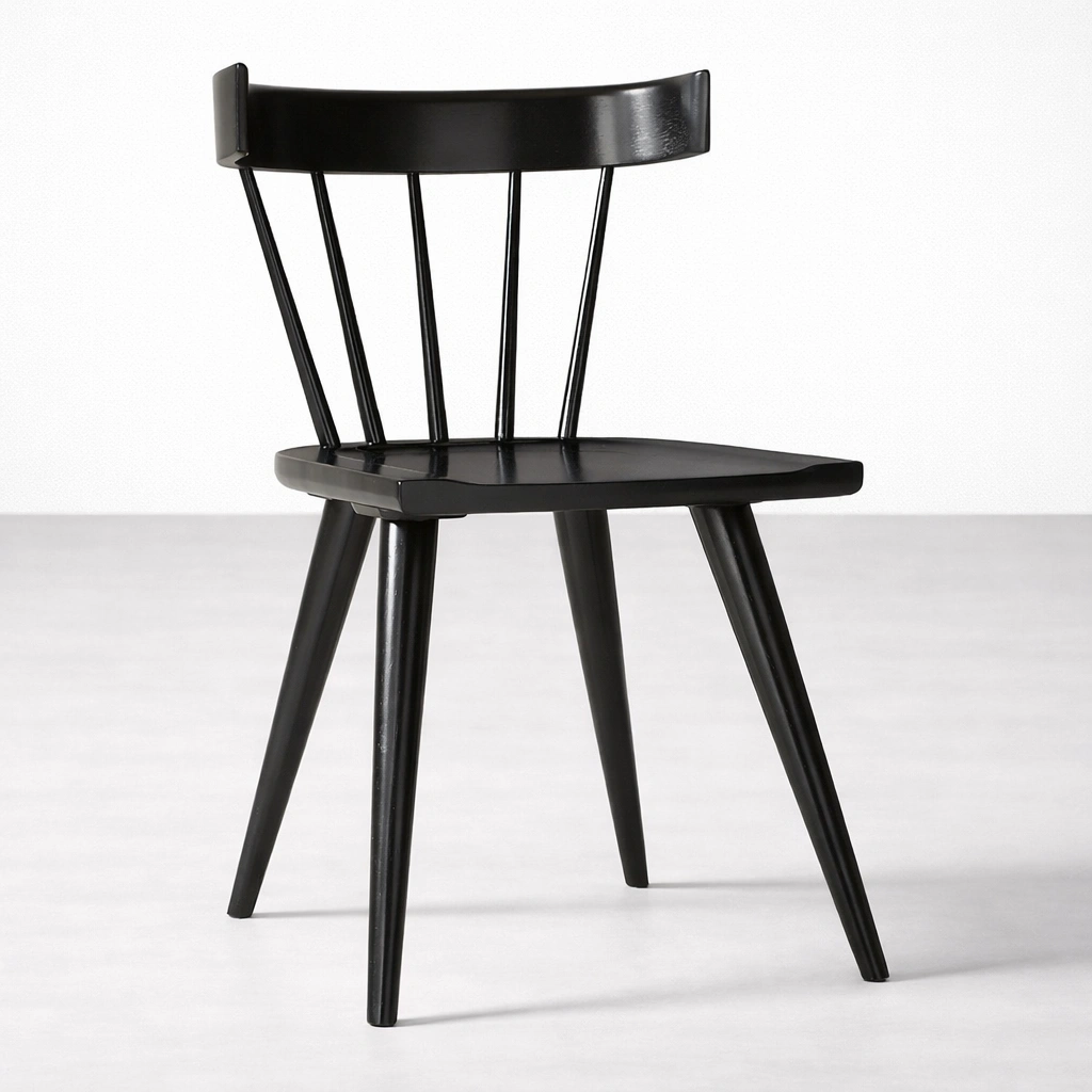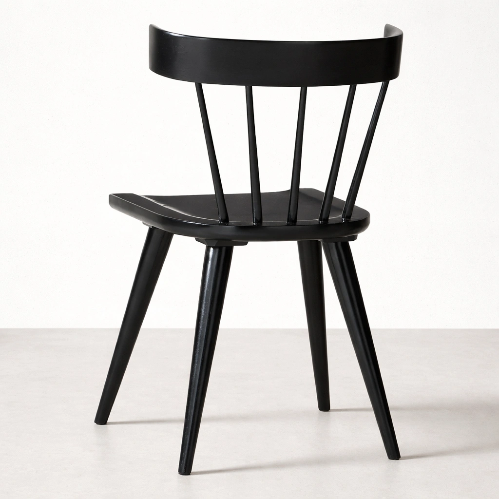 Crafted from seasoned premium solid teakwood, this solid teakwood black dining chair features a smooth contoured seat and a classic spindle back structure that provides both comfort and visual balance. The gently curved top rail supports the back ergonomically, while the tapered legs ensure stability and strength for everyday use.