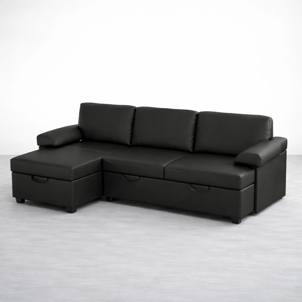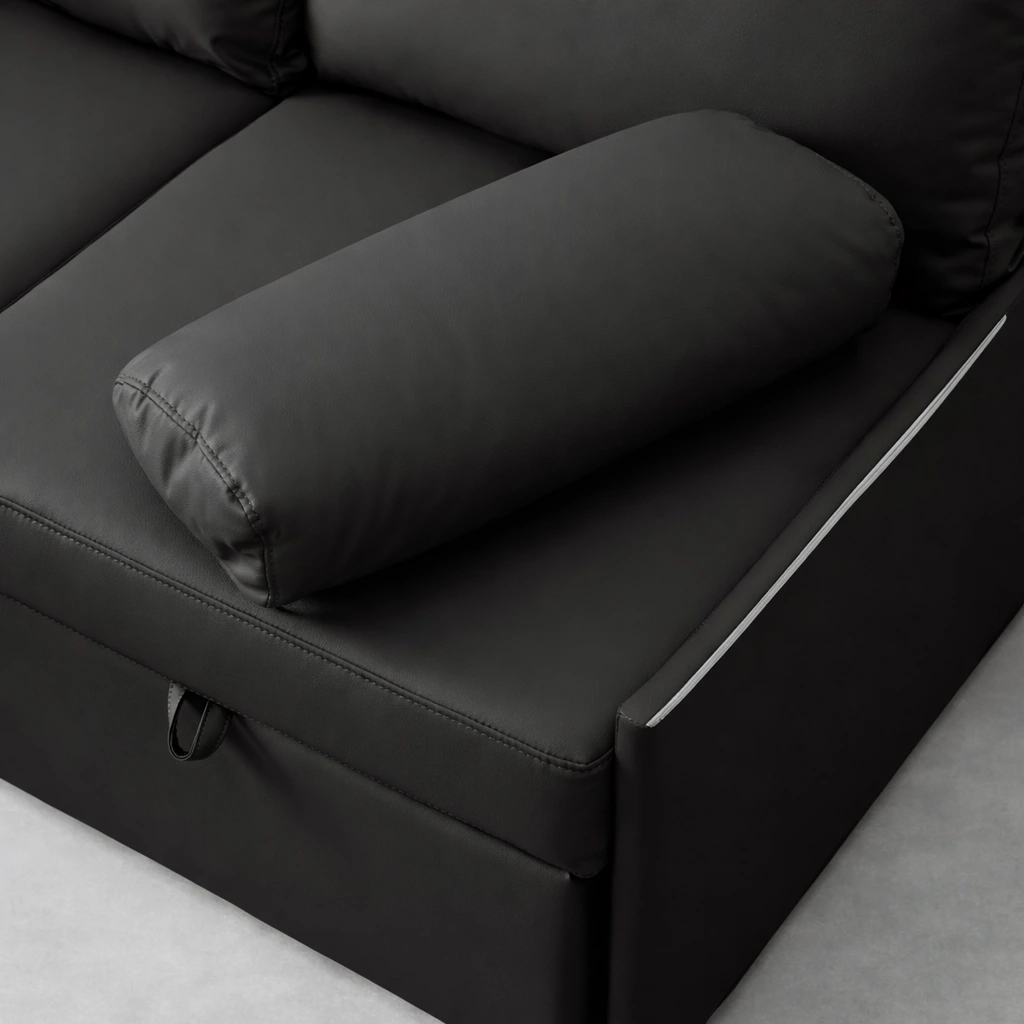 We build Nova on a strong teakwood frame for dependable support. The black leatherette upholstery offers a refined, easy-to-maintain finish that suits modern living rooms, offices, and guest spaces. The silhouette stays simple and balanced, with comfortable back cushions and supportive arm bolsters for relaxed seating. black l shape sofa cum bed