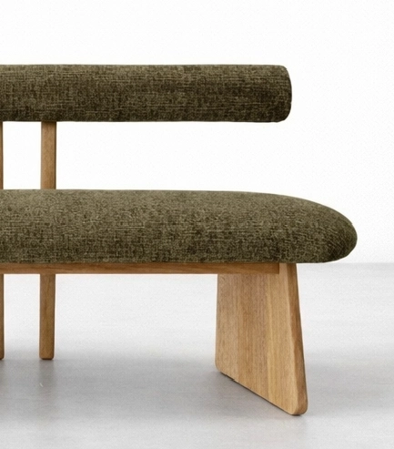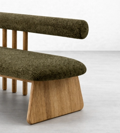 The textured olive upholstery gives the piece a rich and grounded look, while the natural ash wood frame adds warmth and visual contrast. Its broad sculptural side supports and slim center back rods bring a clean architectural feel without making the bench appear heavy. The design feels comfortable, composed, and quietly distinctive.