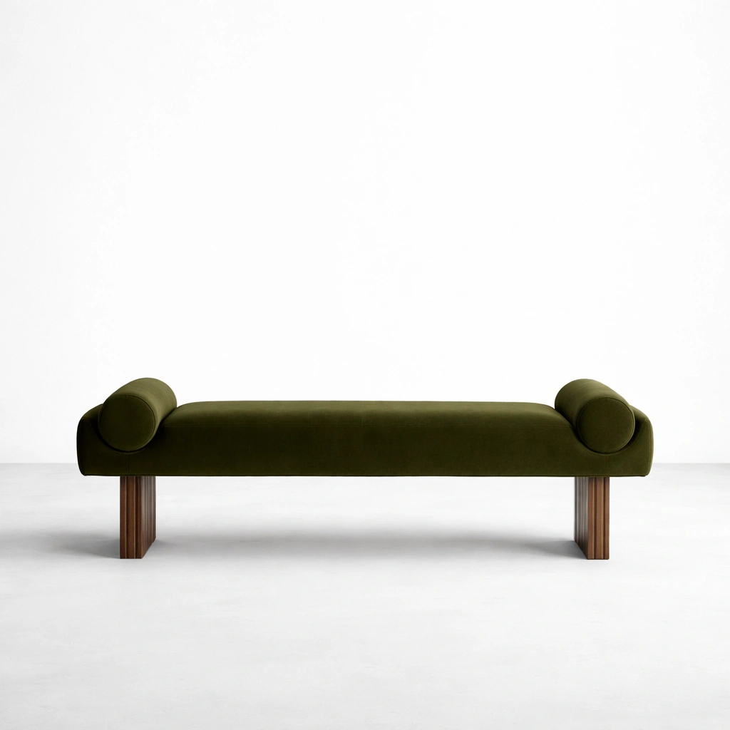 The olive bolster teak wood bench is thoughtfully designed for interiors that value comfort, softness, and clean statement furniture. Its long upholstered seat is framed by rounded bolster ends on both sides, giving the bench a distinctive silhouette that feels polished yet welcoming. The deep olive tone adds richness to the piece, while the warm wooden legs create a balanced contrast that suits both modern and transitional interiors.