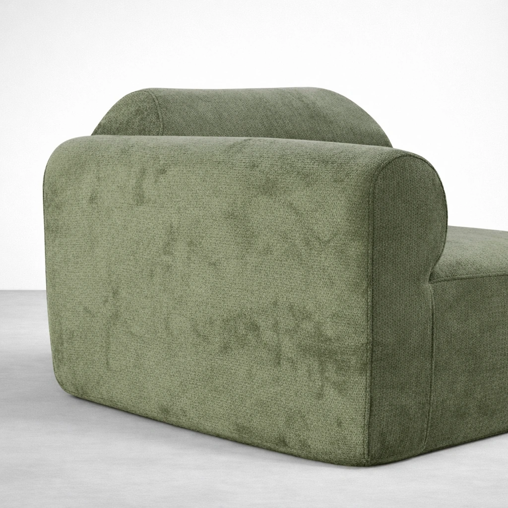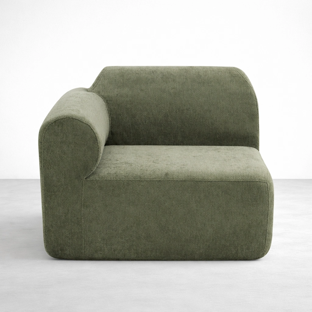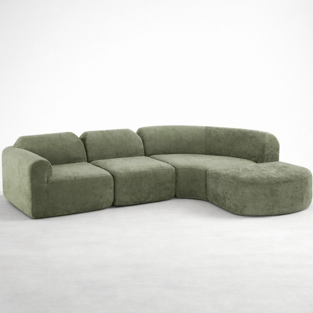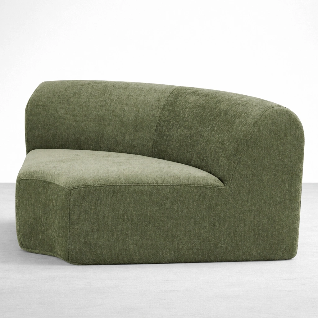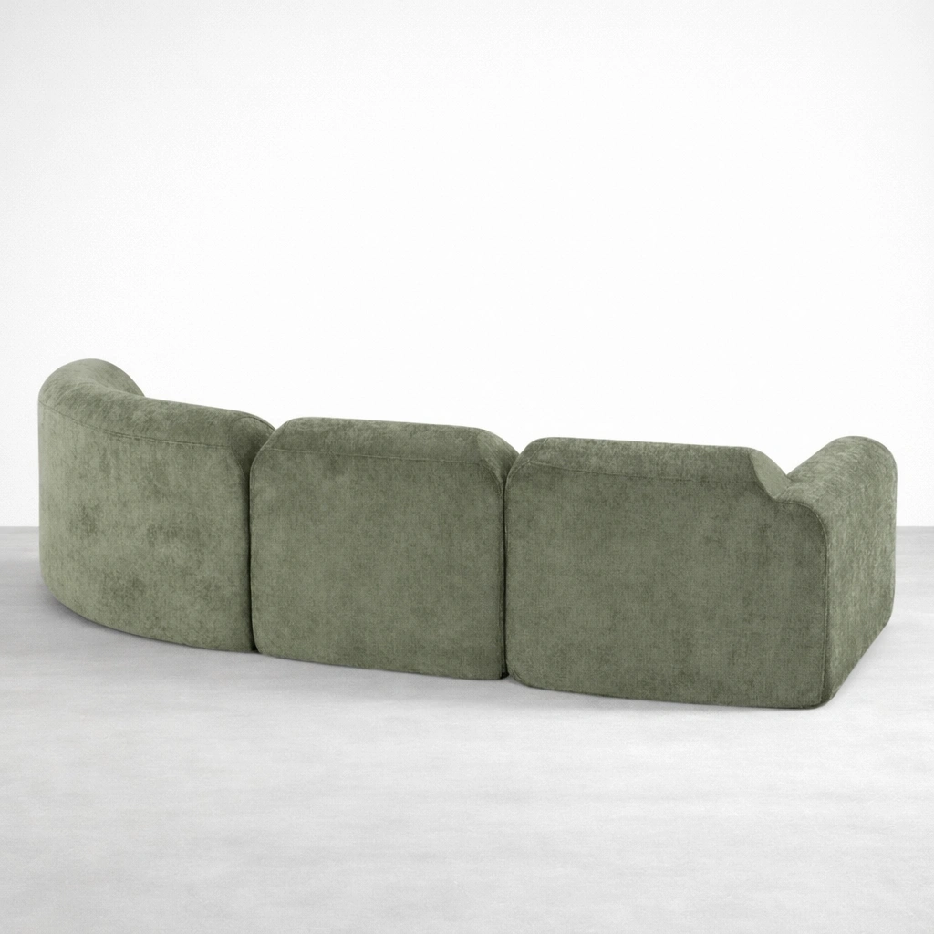 This olive green modular sectional sofa is designed for homes that prefer a clean, modern look with a softer, welcoming shape. The curved back profile and generous seat depth help the sofa feel comfortable for daily sitting, lounging, and hosting. Inside, a seasoned solid teakwood frame provides strong support and long-term reliability.