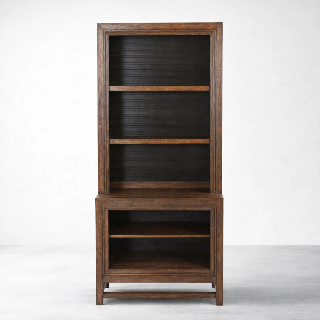 This open shelf teak wood showcase cabinet offers useful everyday storage for books, décor accents, collectibles, tableware, sculptures, planters, candles, and styled essentials. The upper shelves allow decorative display, while the lower open section provides practical storage for larger items, baskets, or stacked books, making it suitable for living rooms, study spaces, bedrooms, offices, and thoughtfully styled residential interiors.