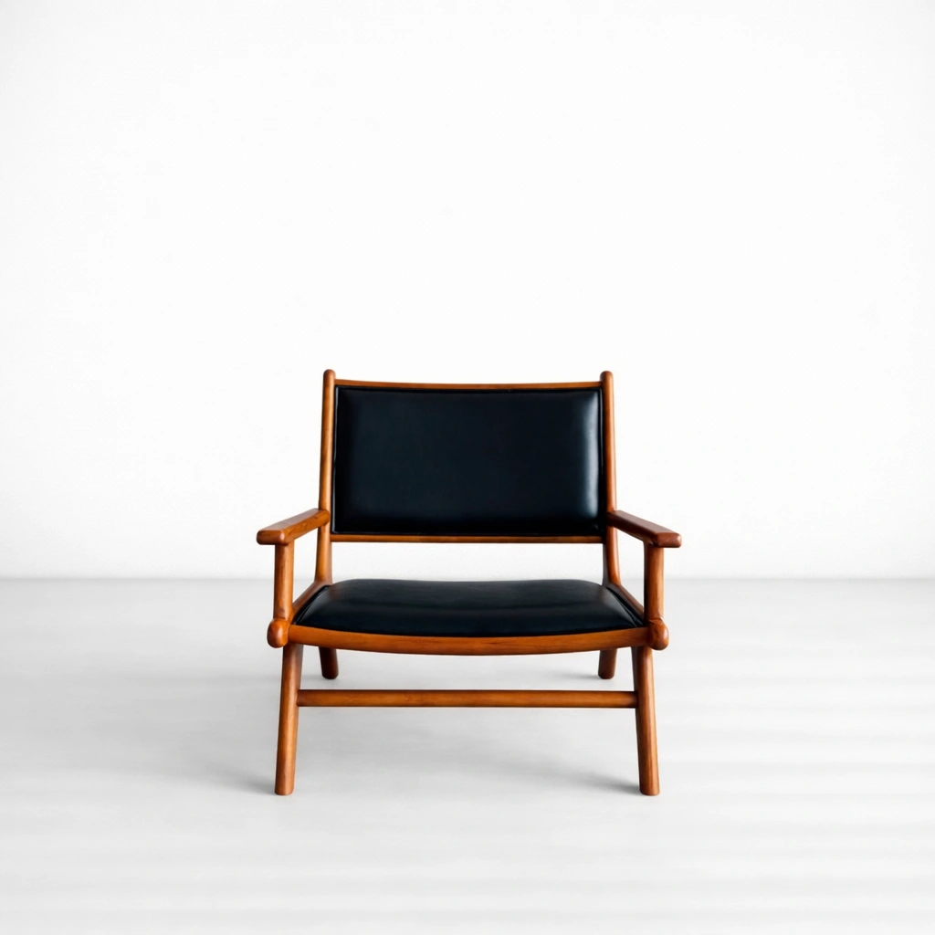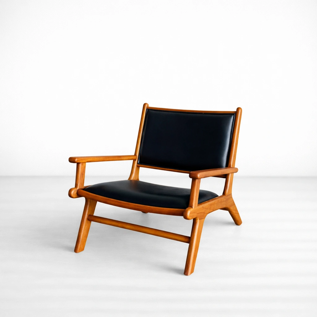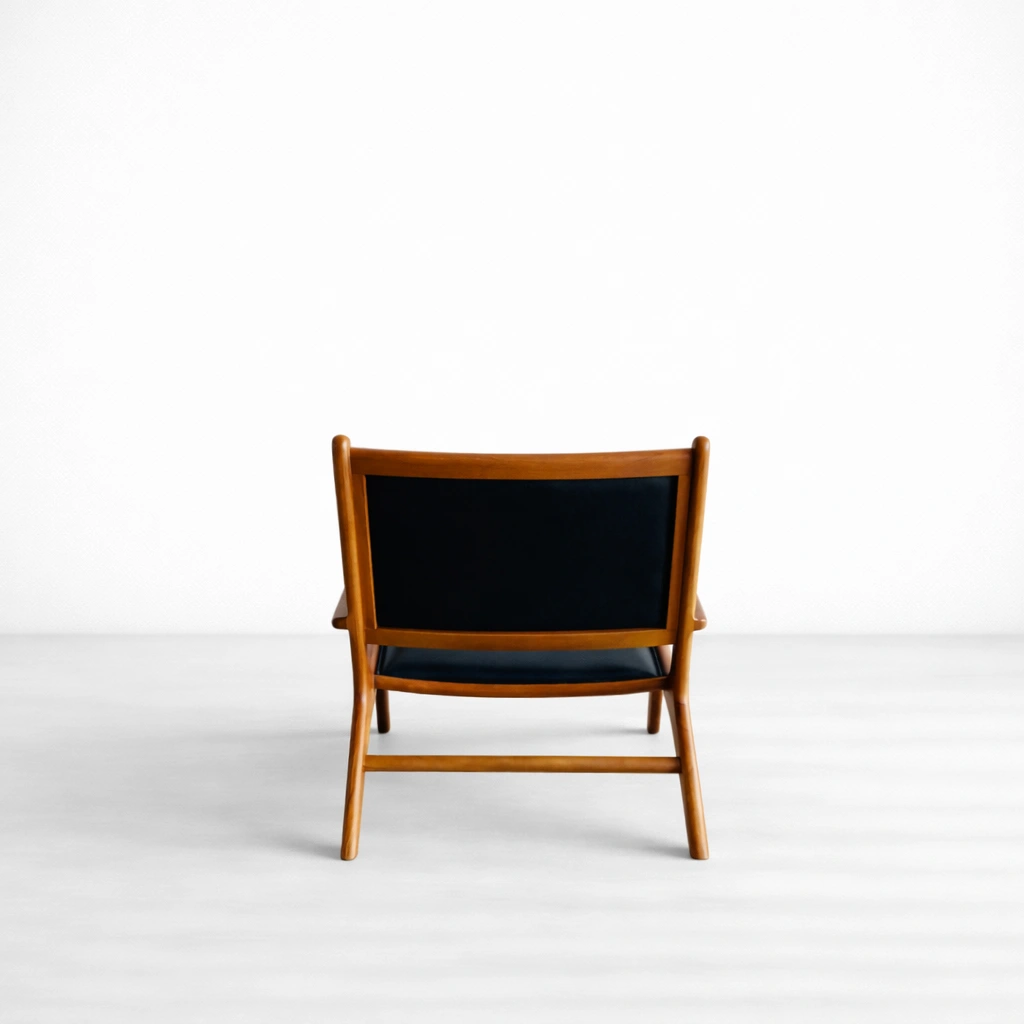 Its upholstered seat and backrest are finished in a rich black tone that creates a striking contrast against the warm natural wood frame. The low, relaxed proportions and gently angled form make the chair comfortable for longer seating, whether used in a living room, lounge, reading corner, study, studio, or private office setting teakwood upholstered lounge arm chair.