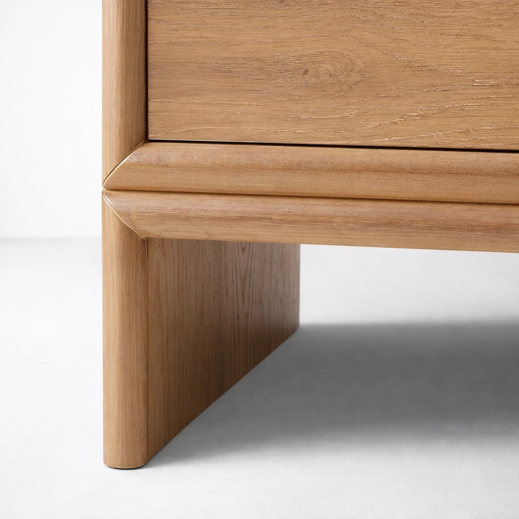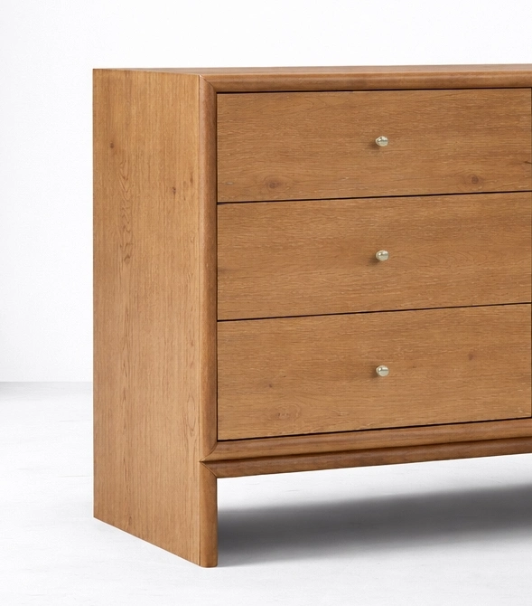 The form of the Rowan Panel Leg Ash Wood Chest of Drawers is simple, but its framed outline, warm wood finish, and distinctive panel leg support give it a refined identity. The broad side structure and lifted base make this panel leg ash wood 6 drawer dresser feel grounded, elegant, and practical for everyday use.