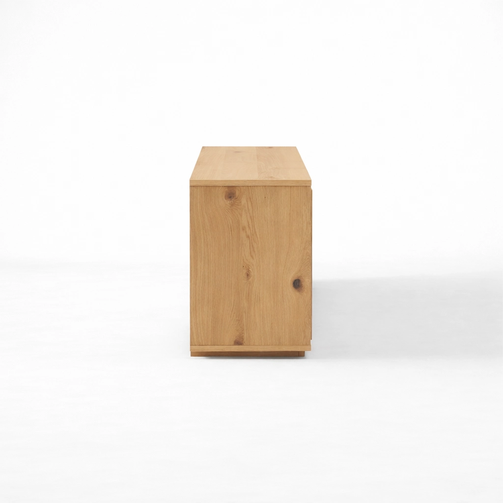 Its ash wood construction highlights the fine grain, soft tonal variation, and lasting character of the material, giving the piece a warm and composed look. The clean front layout keeps the appearance minimal, while the evenly divided panel design adds quiet rhythm and balance without disturbing the simplicity of the form. The low profile and grounded base help the console feel stable, refined, and easy to place in a wide range of interiors.