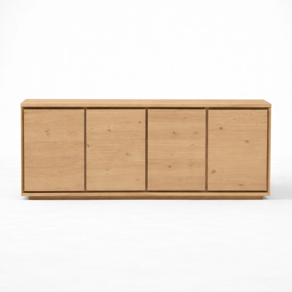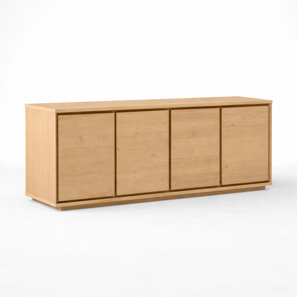 The form of the Panel Line Ash Wood Media Console is simple, but its proportions give it a quiet and memorable identity. The balanced four-door front, warm ash wood grain, and grounded base make it suitable as a TV unit, media cabinet, entertainment console, or long storage console for interiors that value both utility and understated design.