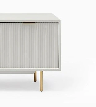 Its teak wood construction offers durability, strength, and lasting character, while the fluted front detailing adds depth and rhythm to the design. The light pearl-toned finish creates a soft and refined look that works beautifully in modern interiors, while the brushed gold handles and legs introduce a subtle contrast that feels elegant without appearing heavy. The overall composition is minimal, but it still has a strong visual identity.