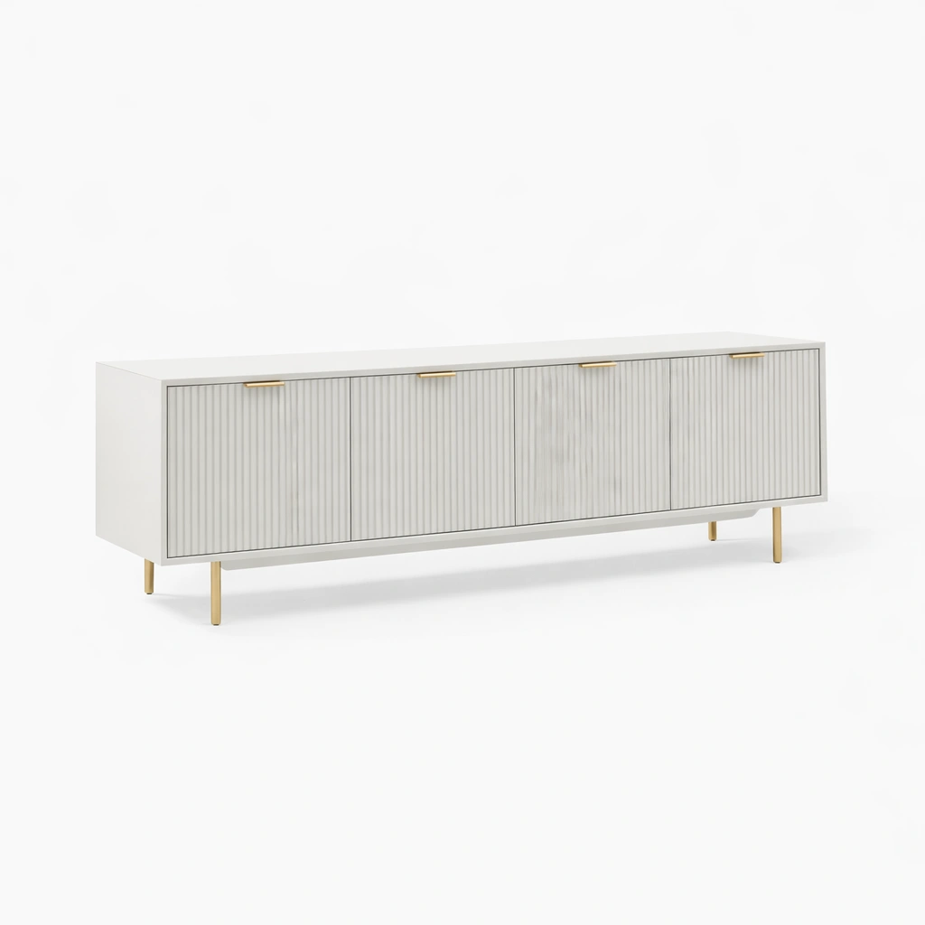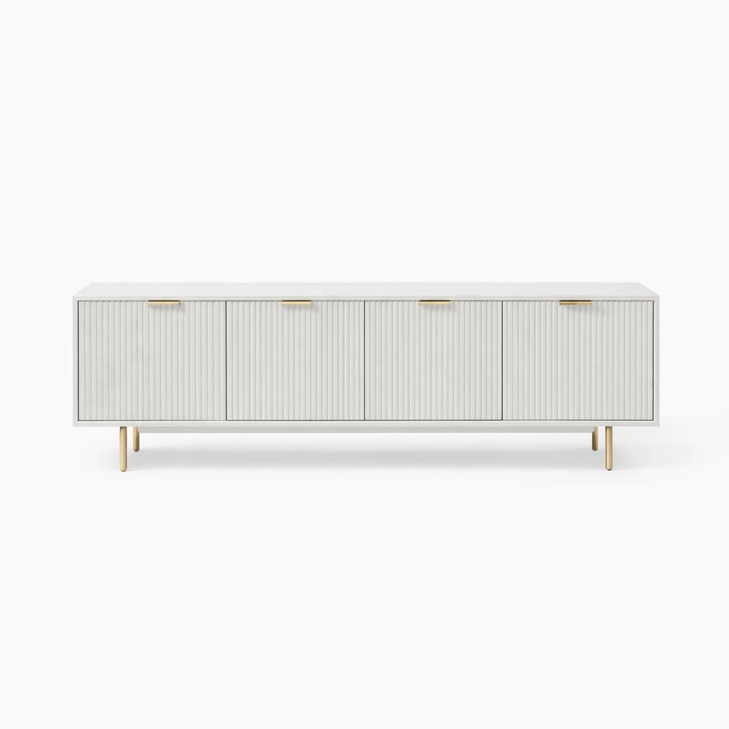 The INTERIORZE Pearl Fluted Teak Wood Media Console is a thoughtfully designed furniture piece created for interiors that appreciate clean lines, soft texture, and understated elegance. Made with a teak wood frame, this media console features a long horizontal silhouette, four fluted front doors, a refined light finish, and slim metallic legs that give the piece a balanced and contemporary presence.