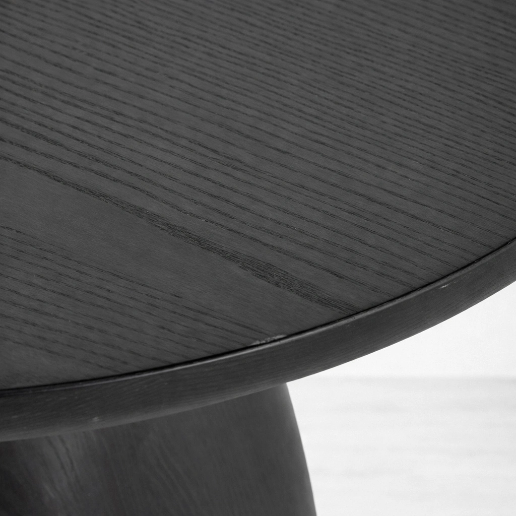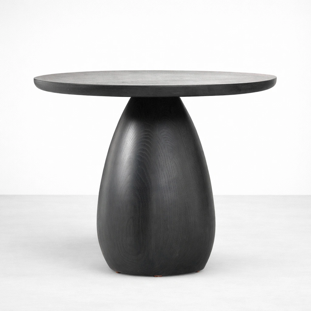 Its teak wood construction offers durability, warmth, and timeless character, while the dark polished finish gives the piece a refined and understated presence. The subtle wood grain remains visible through the finish, adding depth and texture to the overall form. The contrast between the slim round top and the fuller pedestal base gives this design a balanced silhouette that feels both artistic and practical.