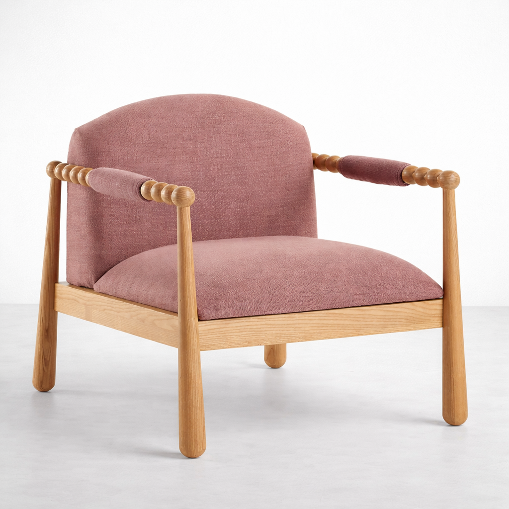 The INTERIORZE Pink Ash Wood Armchair combines a sculptural ash wood frame with soft dusty rose upholstery to create a statement lounge chair for contemporary interiors. With its rounded back, generous seat and unique beaded arm detail, this armchair adds character to living rooms, bedrooms, reading corners and stylish hospitality spaces.