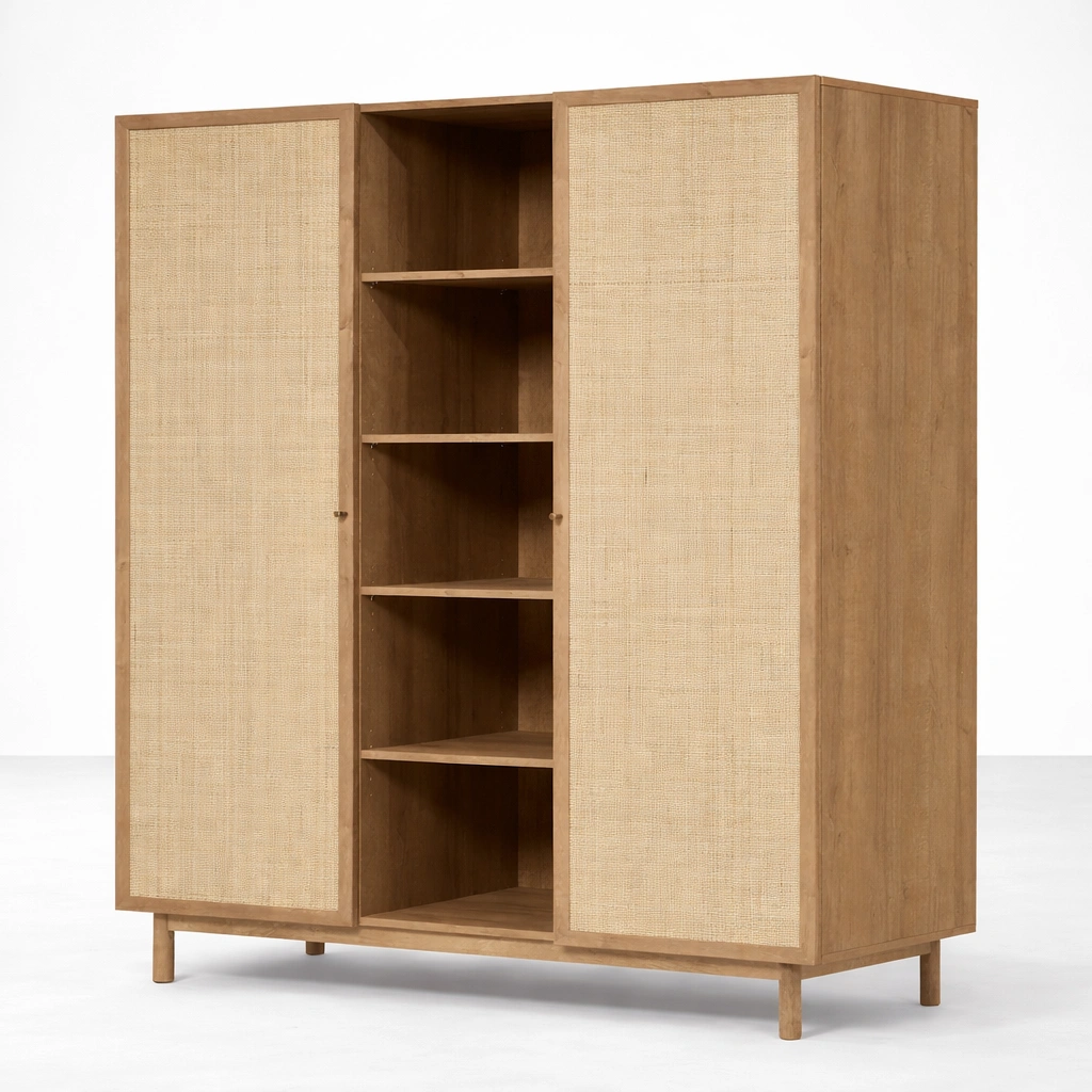Design Highlight: Full-height cane doors with open center shelf layout and warm natural wood texture
