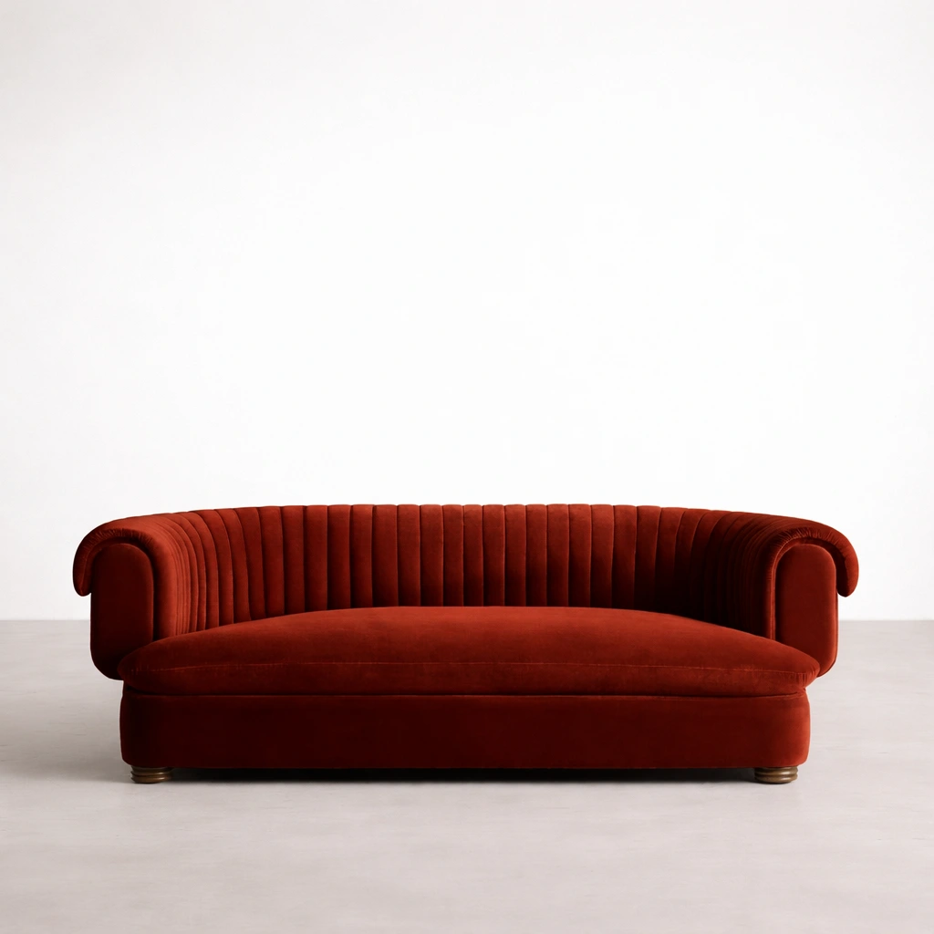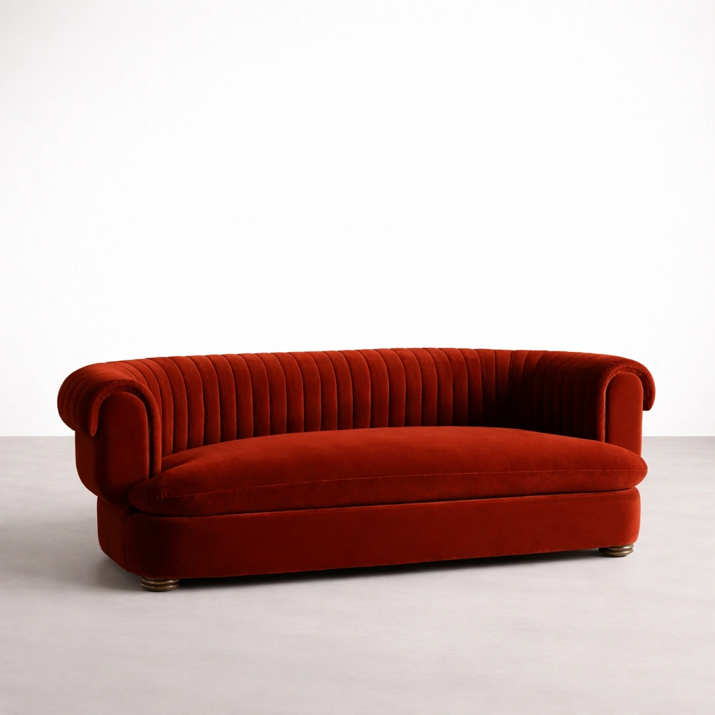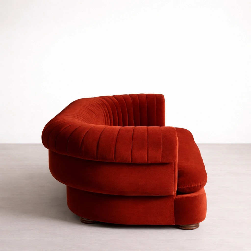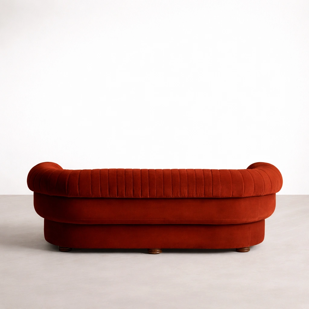• Back view of red velvet sofa with channel tufting and rounded silhouette