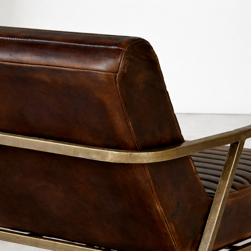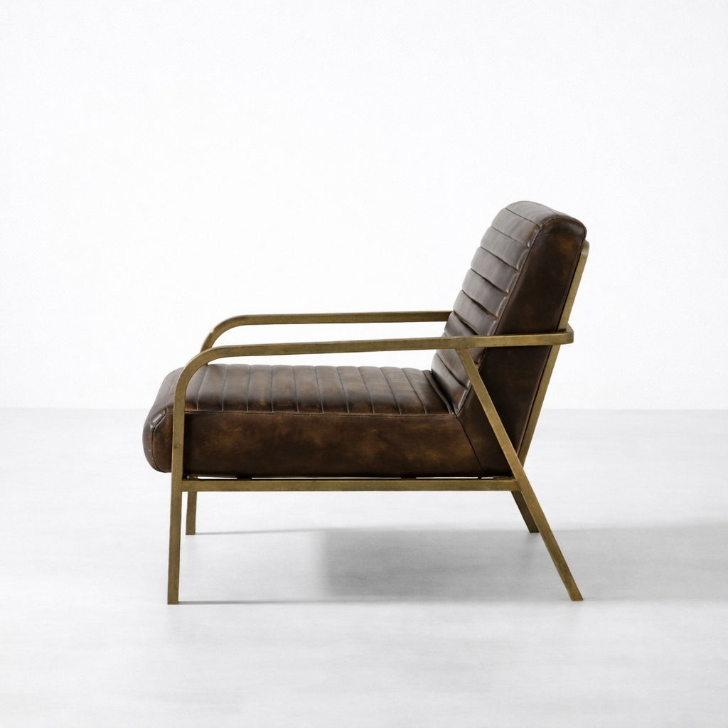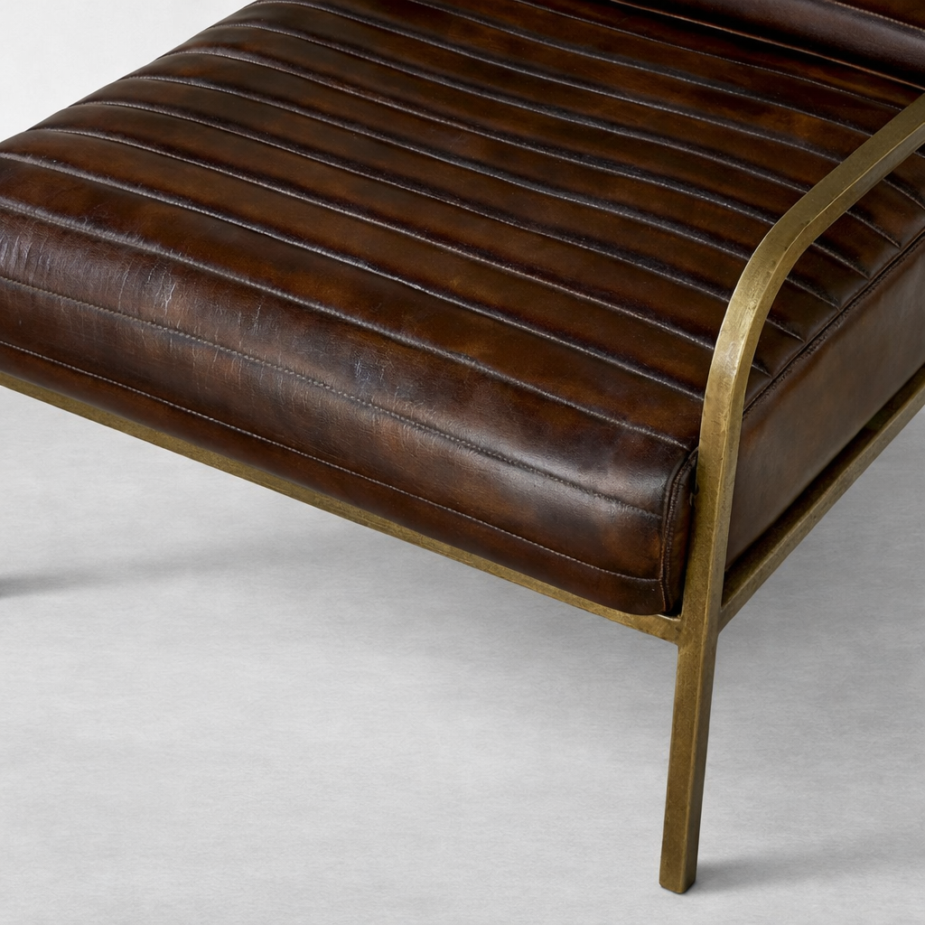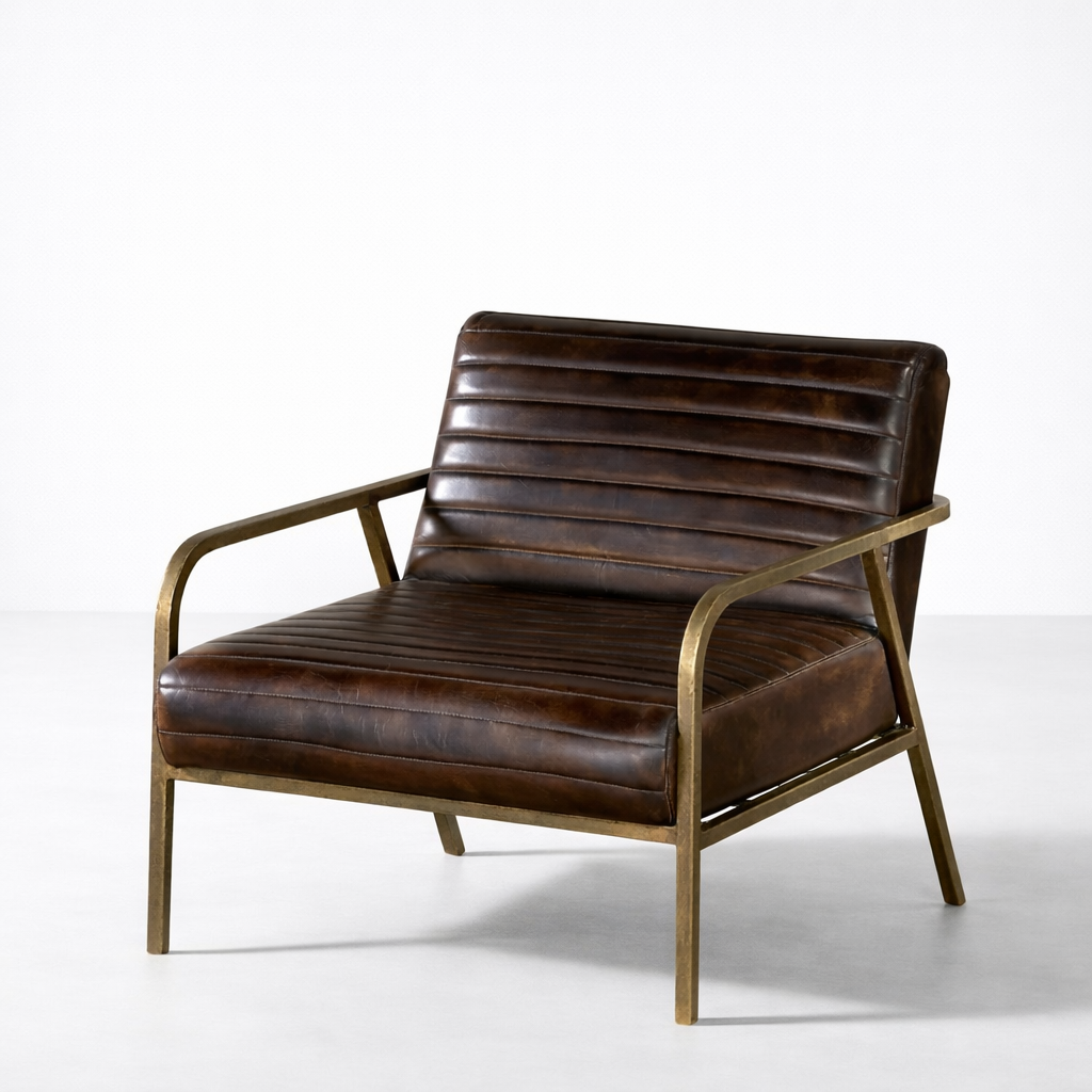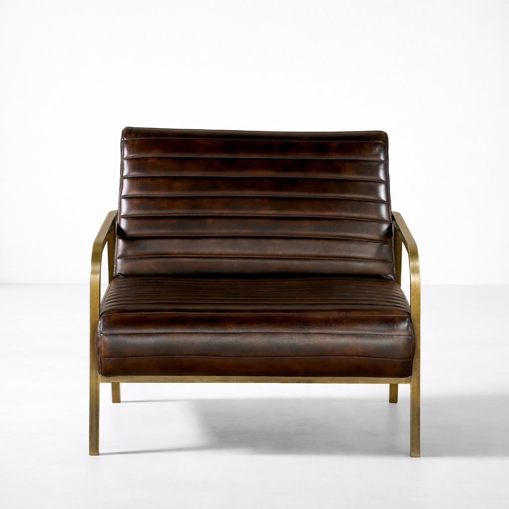 The Ridgeway is a refined brown leather lounge chair designed for everyday comfort and lasting style. The horizontal channel stitching adds structure and texture, while the antique-brass toned frame gives it a clean architectural profile that works beautifully in modern, industrial, and vintage-inspired interiors.