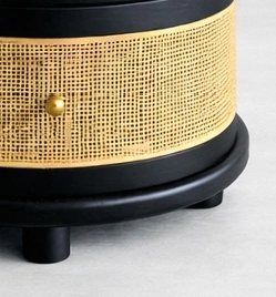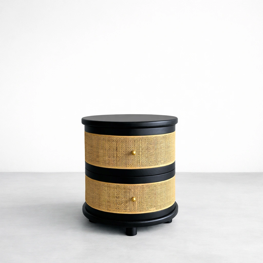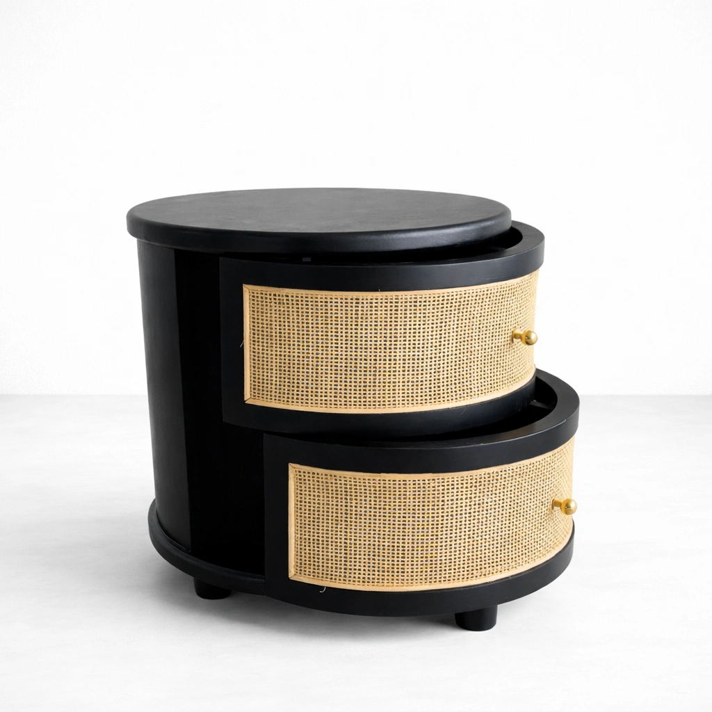Its round silhouette, black polished teakwood frame, and cane drawer fronts create a distinctive look with both texture and softness.