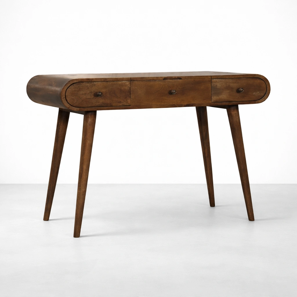 This piece works beautifully in bedrooms, study rooms, home offices, and creative corners. Its rounded edges soften the overall form, making it suitable for both modern and slightly classic interiors. The design feels compact yet functional, and the warm teak finish brings natural richness to the space without looking heavy.