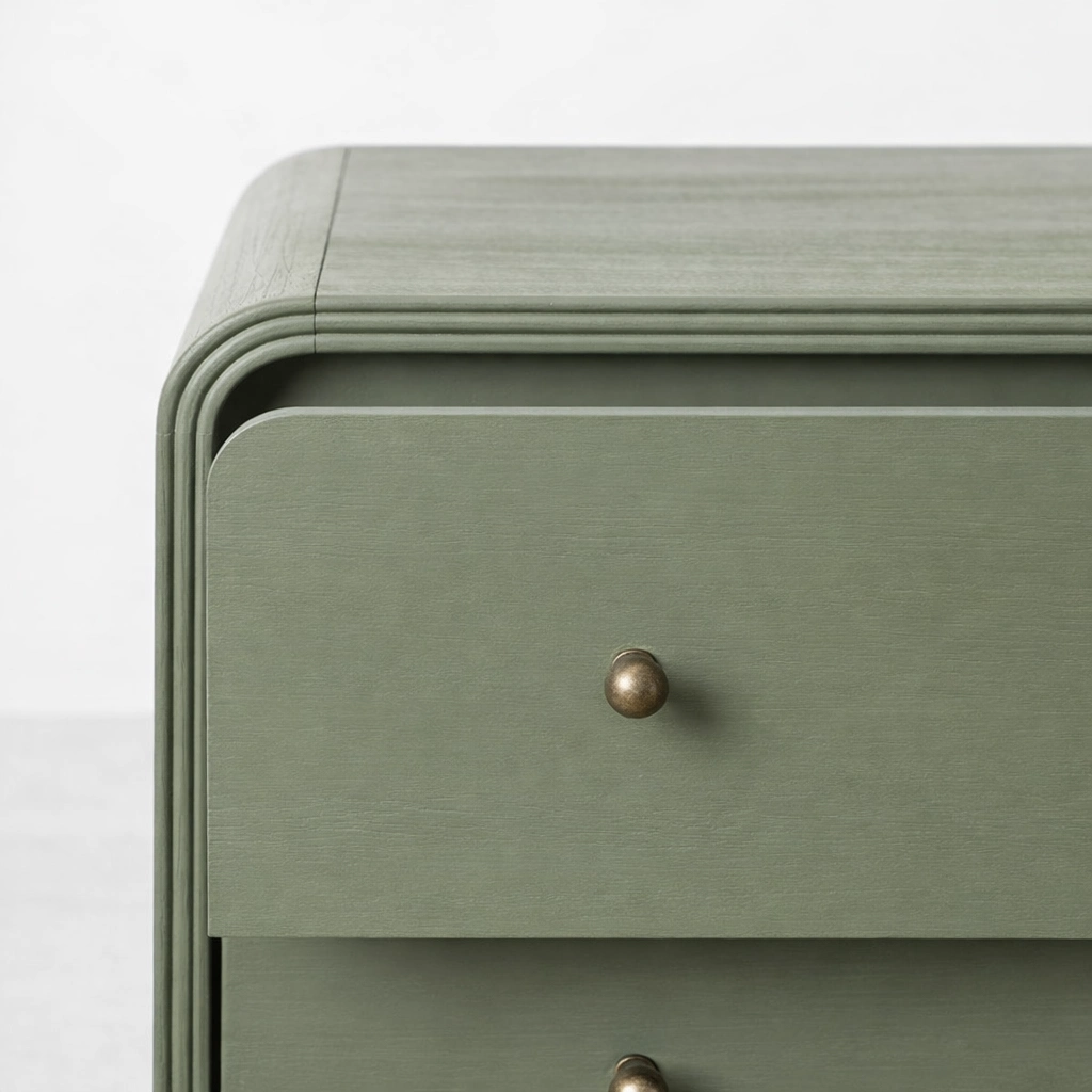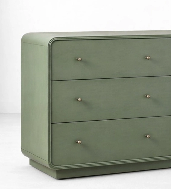 Its muted sage green finish, rounded outer profile, and clean six-drawer layout give it a calm and refined furniture character.