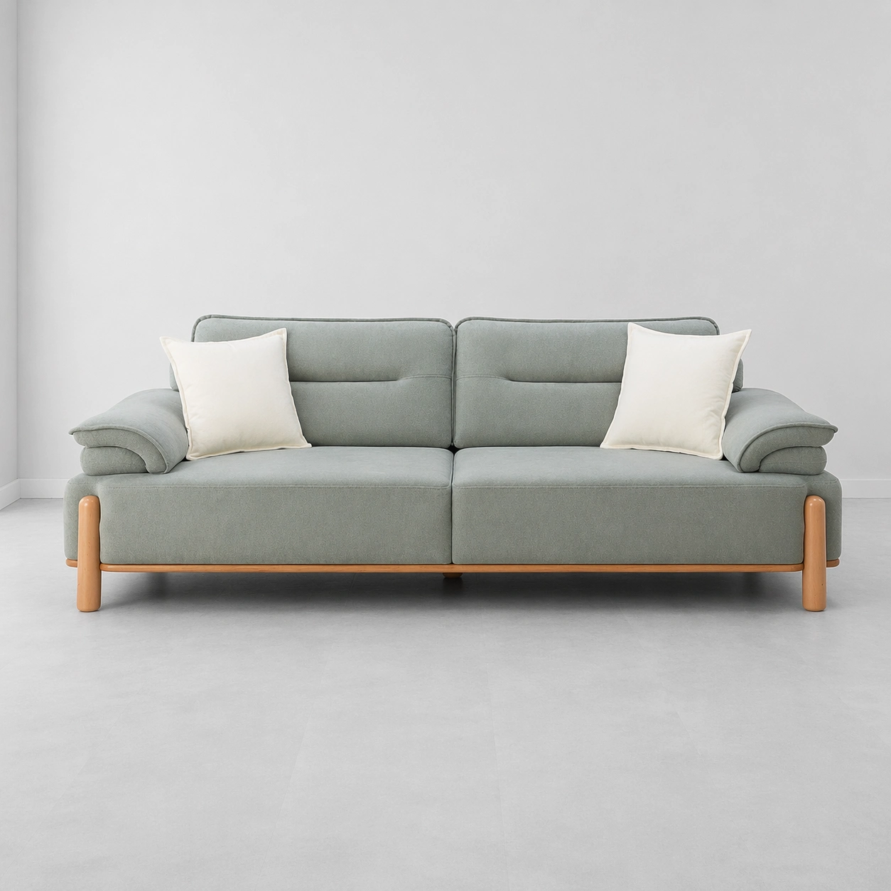 • Design Detail: sage grey fabric upholstery, wooden base rail, rounded wooden legs, pillow armrests, wide seating, soft back cushions