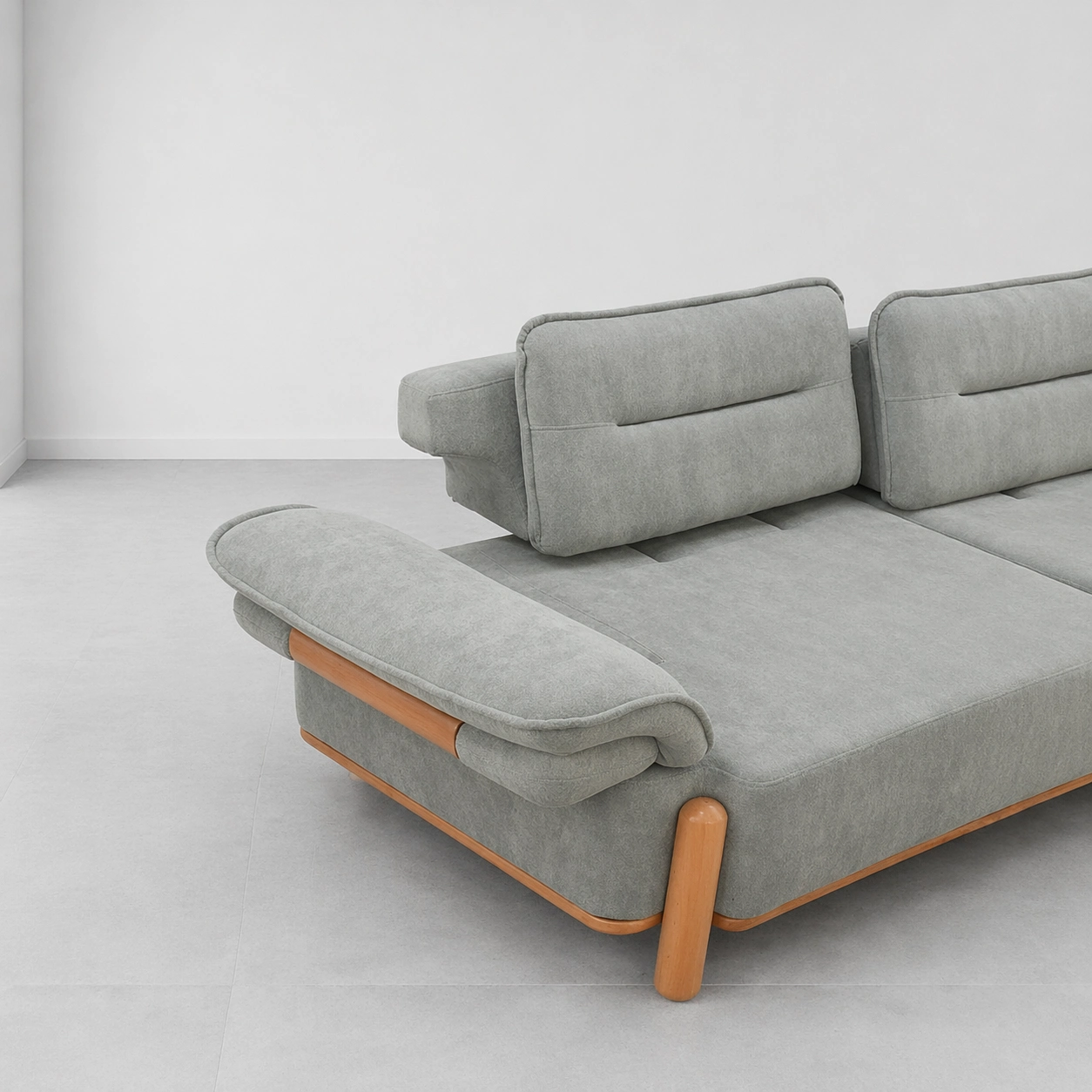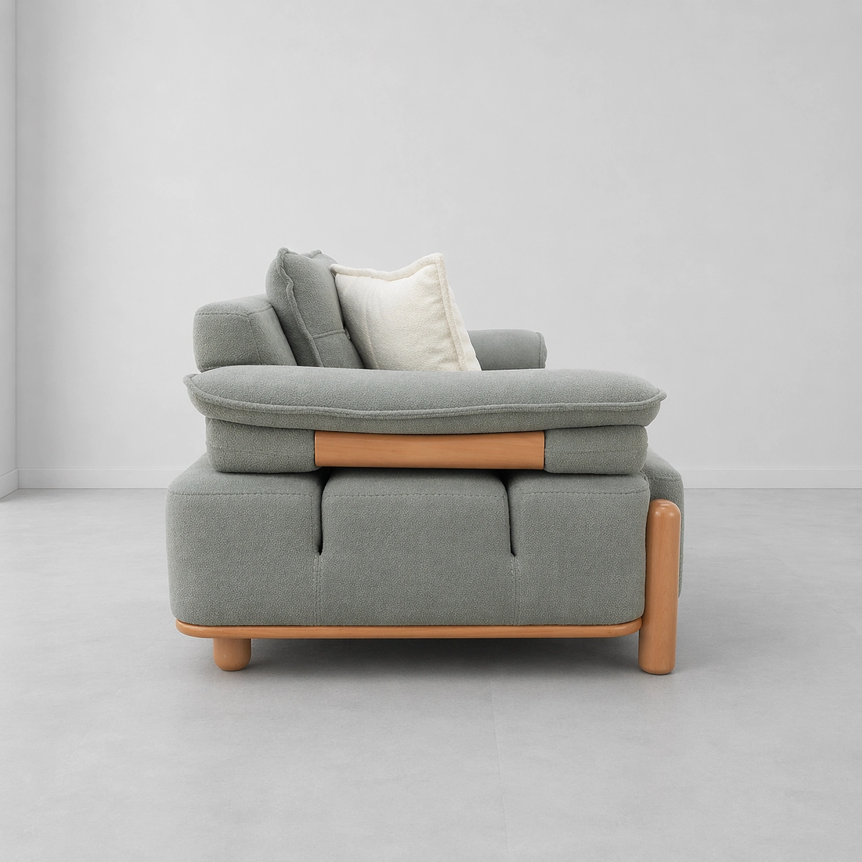 The sofa is made to order and can be customized in size, upholstery, color, wooden polish, foam comfort, stitching, pillows, and base finish. It is ideal for customers who want a modern sofa with a soft premium look and practical comfort sage grey fabric sofa.
