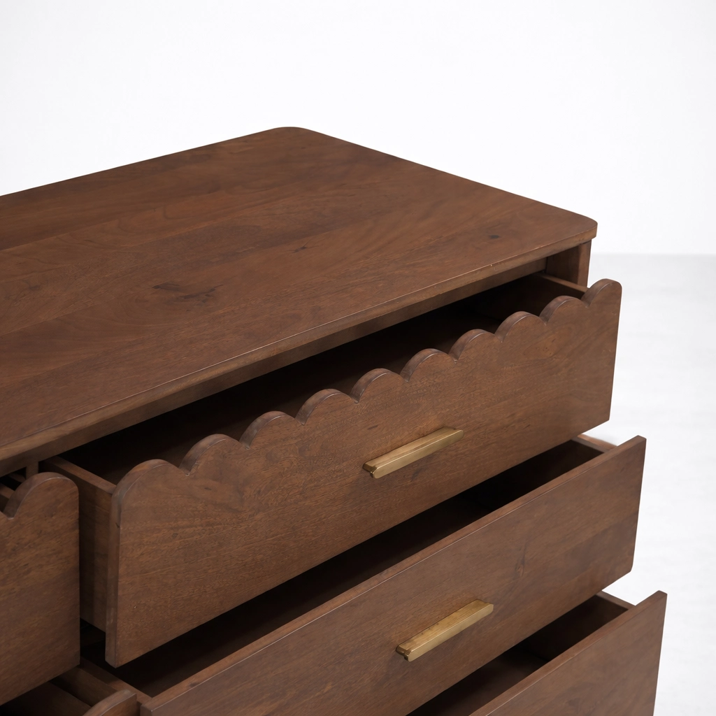 Scalloped teak wood 6 drawer dresser by INTERIORZE is thoughtfully designed for interiors that appreciate warm wood tones, subtle detailing, and practical storage. Crafted in teak wood, this chest of drawers features a balanced six-drawer layout, a rich walnut-toned finish, and a decorative scalloped edge detail on the upper drawer fronts that gives the piece a refined and distinctive presence.