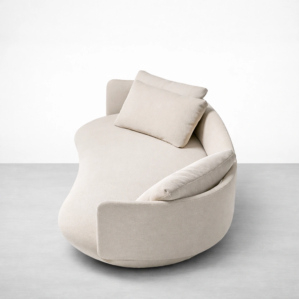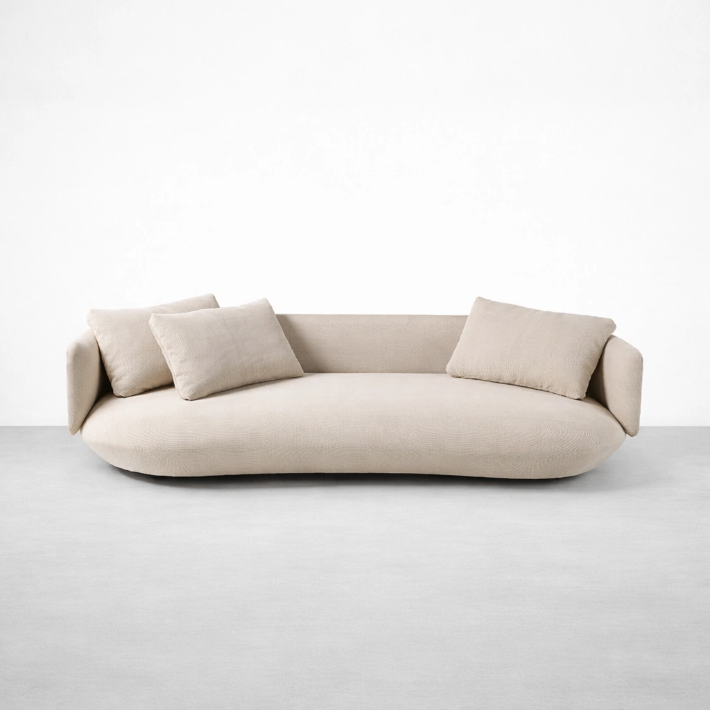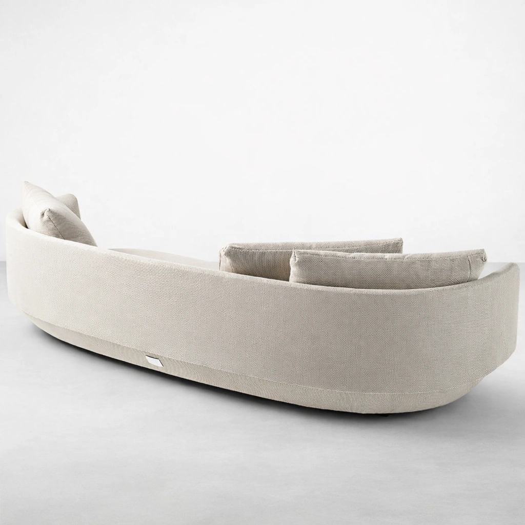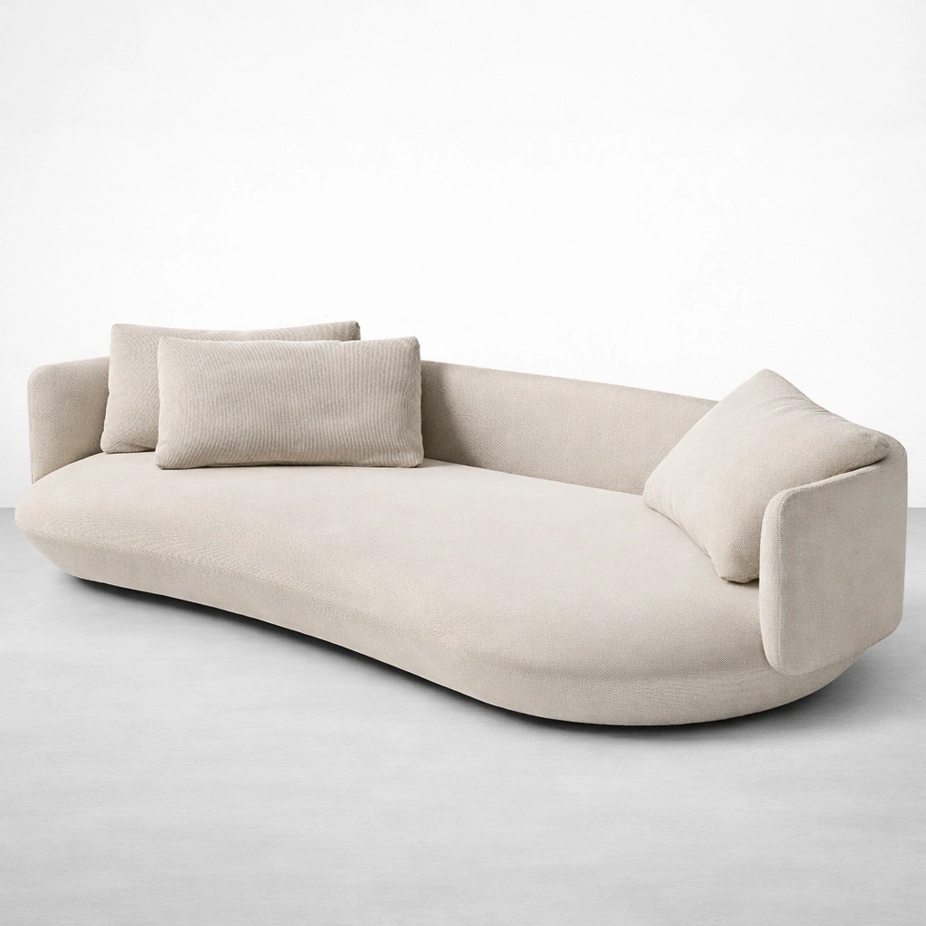 This ivory curved sofa is shaped to feel gentle in a room. The flowing silhouette and softly rounded arms create a comfortable lounge style, while the neutral upholstery keeps the look clean and easy to pair with most decor.