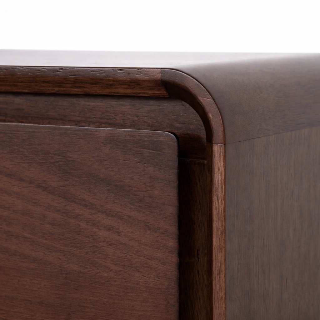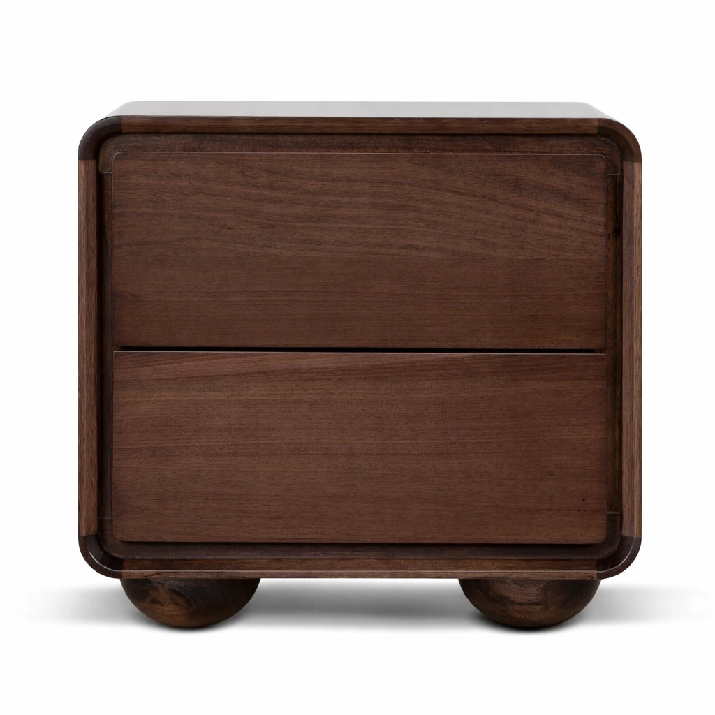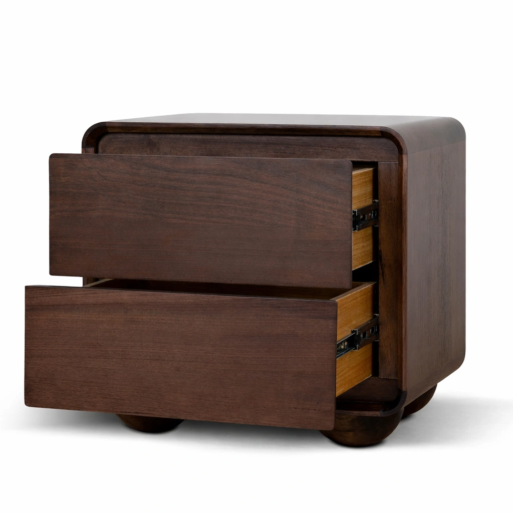 Its standout feature is the softly curved body, which gives the piece a smooth and sculpted look. The rounded corners create a gentle silhouette that feels refined and modern, while the compact footprint makes it easy to place beside a bed without overwhelming the space. The two drawers provide convenient storage for personal items such as books, chargers, glasses, notebooks, or other bedside essentials that you prefer to keep neatly organized.