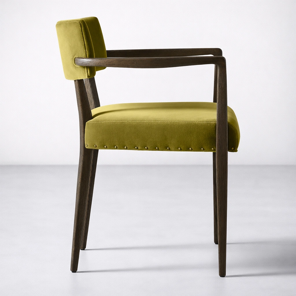 INTERIORZE Avelon olive green upholstered dining chair angled view Teakwood upholstered dining chair with arms AVELON Dining Chair Collectio...