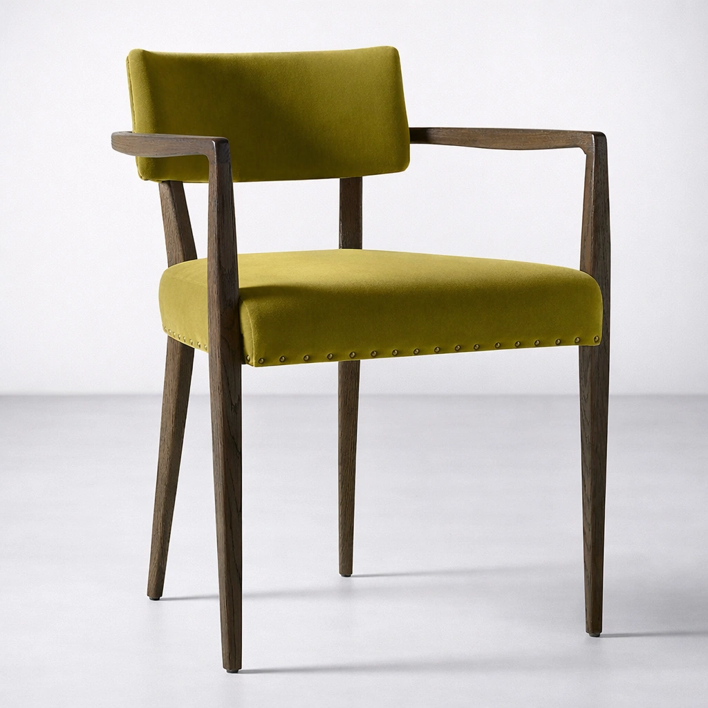 This teakwood upholstered dining chair with arms features a gently curved backrest that provides supportive comfort. The solid wooden armrests extend seamlessly into the tapered front legs, offering both stability and visual continuity. The seat is generously cushioned and finished with subtle nailhead detailing along the base, adding a refined handcrafted touch.