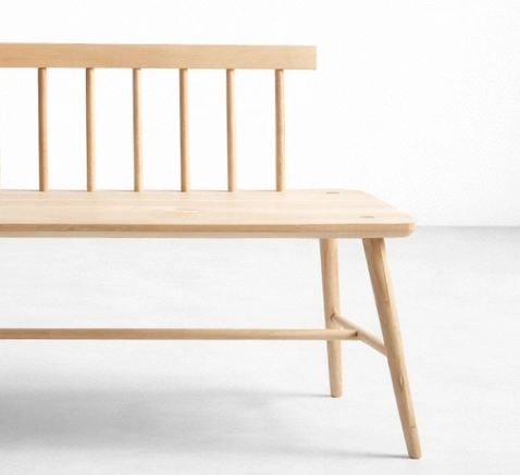 Design Highlight: Long wooden seat with slim spindle backrest and tapered legs