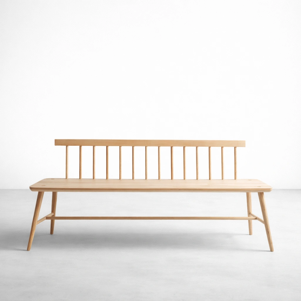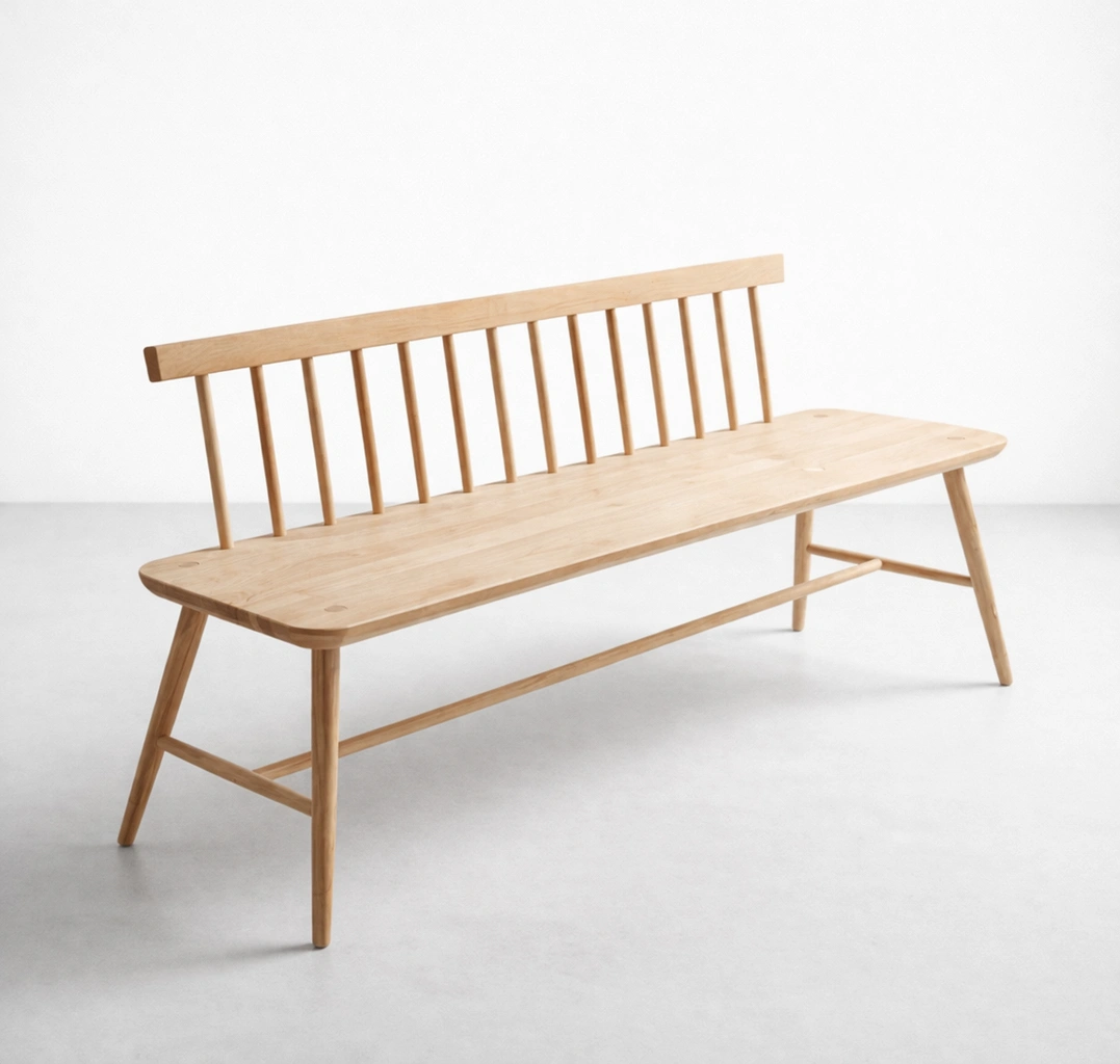 The spindle ash wood bench is designed for interiors that appreciate clean lines, practical seating, and understated wooden warmth. Its long rectangular seat is paired with a slim spindle backrest that gives the bench an airy and elegant profile. The softly rounded edges, tapered legs, and stretcher support create a balanced form that feels both refined and relaxed.
